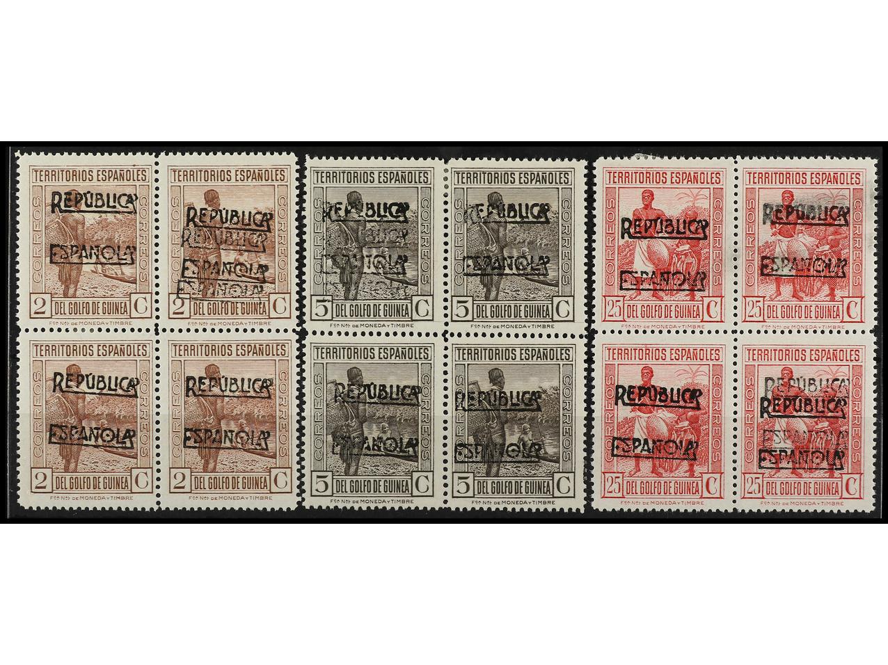 COLONIAS ESPAÑOLAS: GUINEA. 2 cts., 5 cts. y 25 cts. Bloques de cuatro, un sello HABILITACIÓN DOBLE en negro. Muy bonitos. Ed.217Ahh, 218Ahh, 222Ahh.