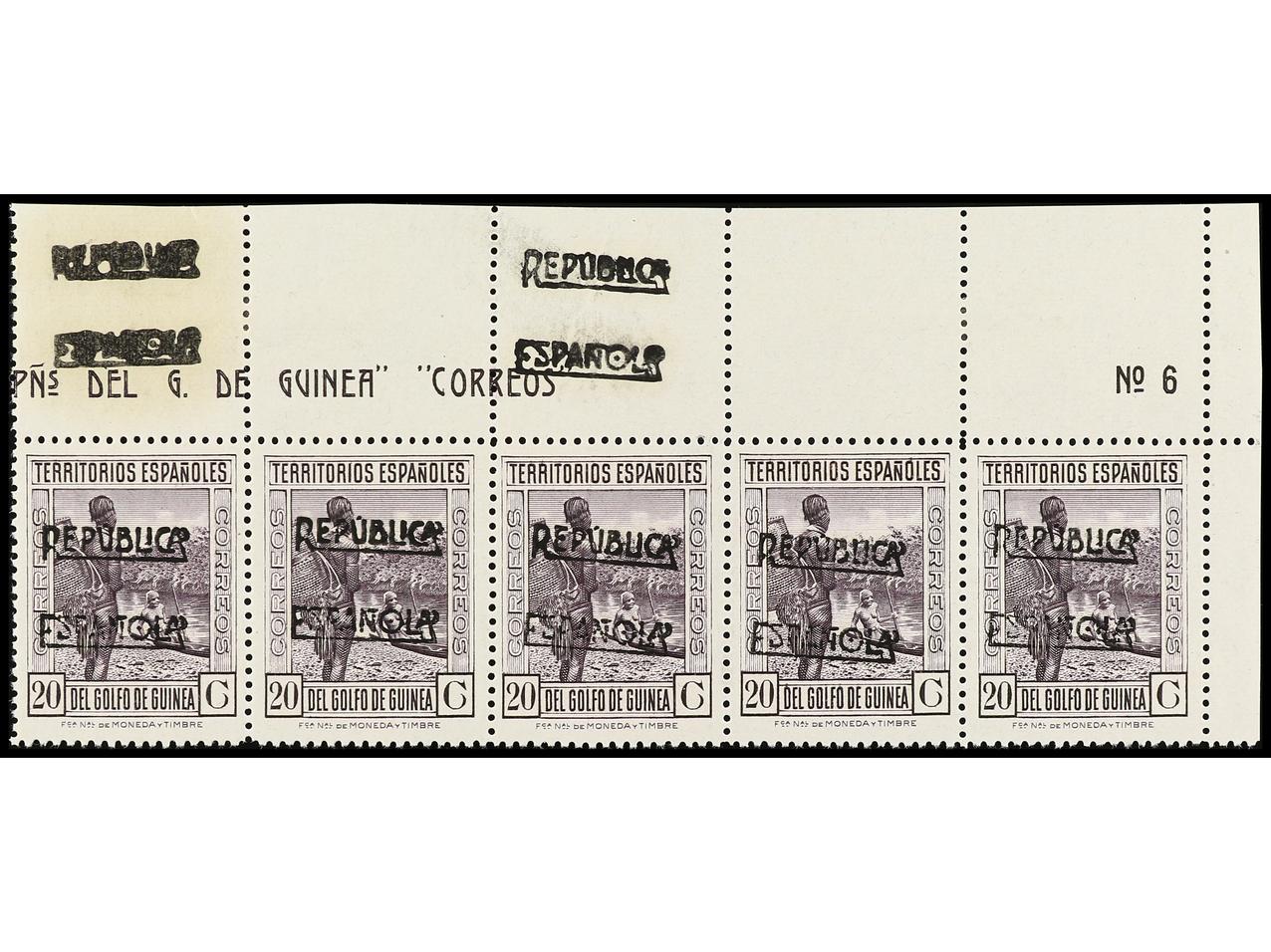 COLONIAS ESPAÑOLAS: GUINEA. 20 cts. violeta tira de cinco, dos sellos doble habilitación en el borde de hoja. PRECIOSOS. Ed.221A. (Image1)