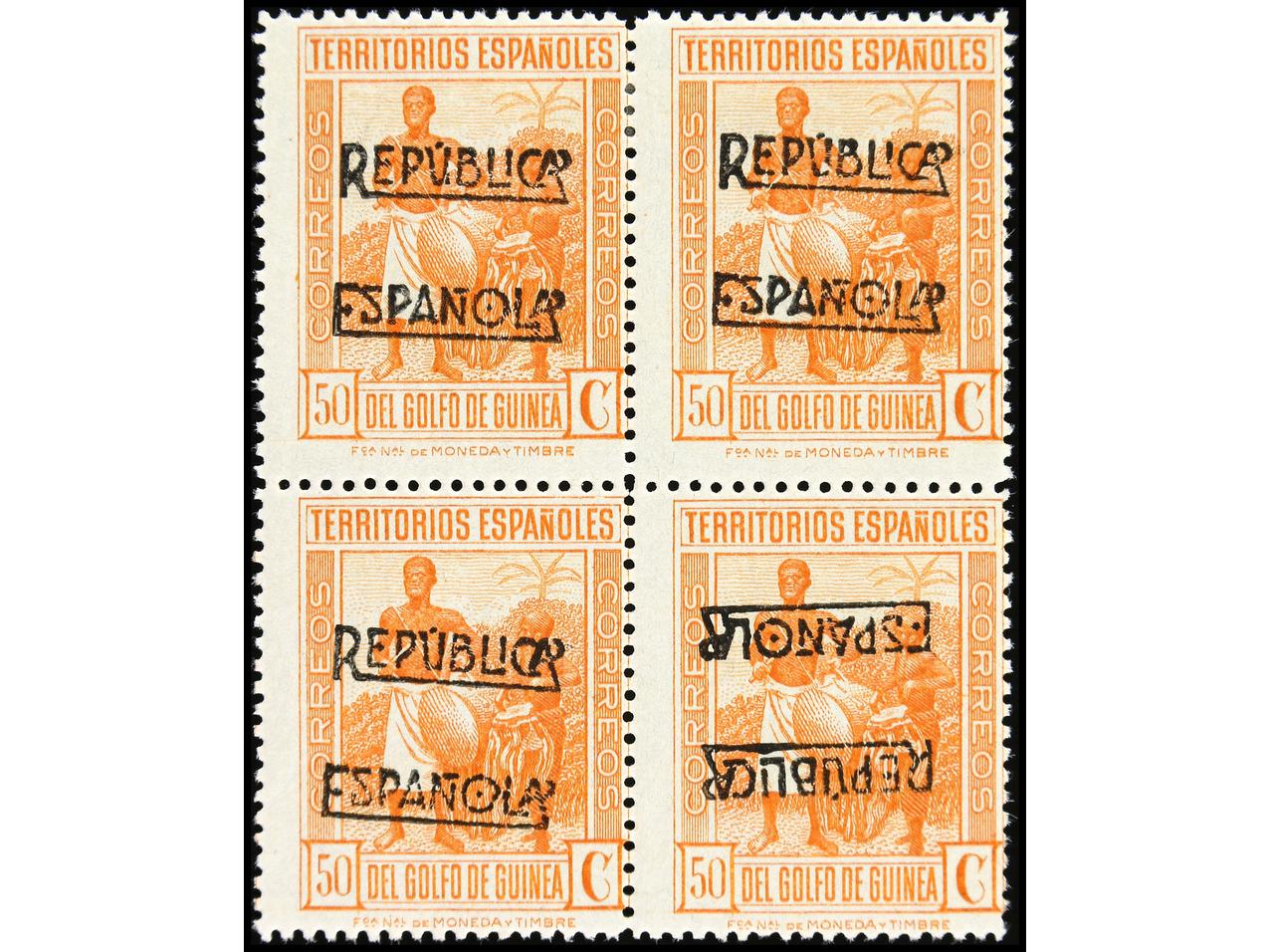 COLONIAS ESPAÑOLAS: GUINEA. 50 cts. naranja. Bloque de cuatro, un sello HABILITACIÓN INVERTIDA. RARO. Ed.225Ahi. (Image1)