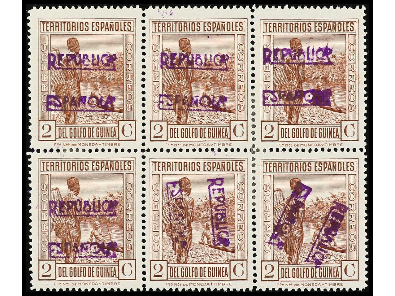 COLONIAS ESPAÑOLAS: GUINEA. 2 cts. castaño. Bloque de seis, un sello HABILITACIÓN VERTICAL y otro EN DIAGONAL INVERTIDA. Ed.217Bhi. (Image1)