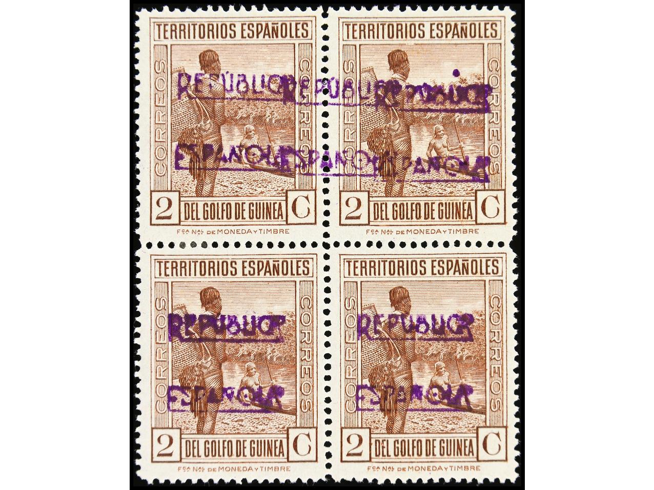 COLONIAS ESPAÑOLAS: GUINEA. 2 cts. castaño. Bloque de cuatro DOBLE HABILITACIÓN a caballo entre los sellos. Ed.217Bhh. (Image1)