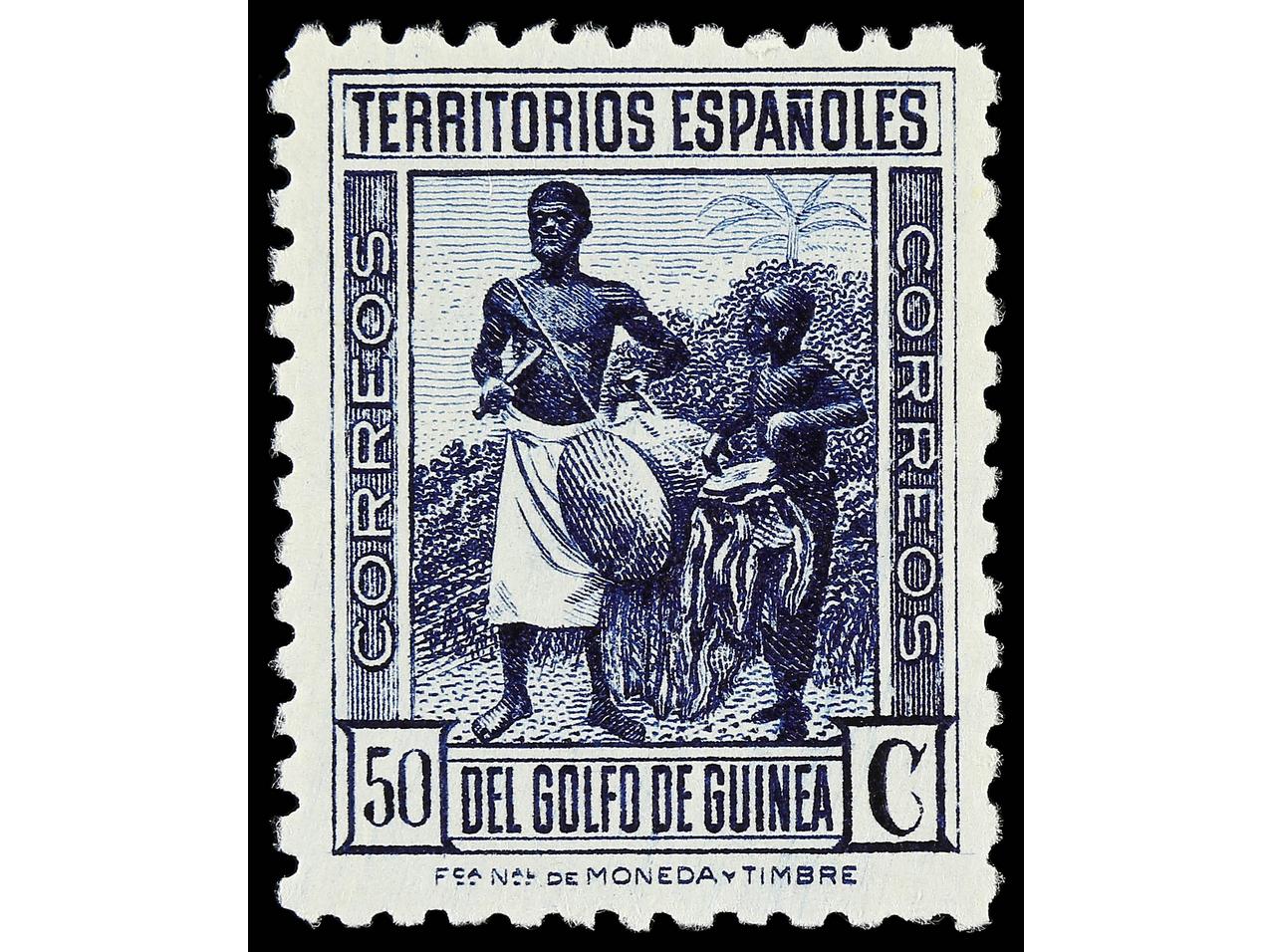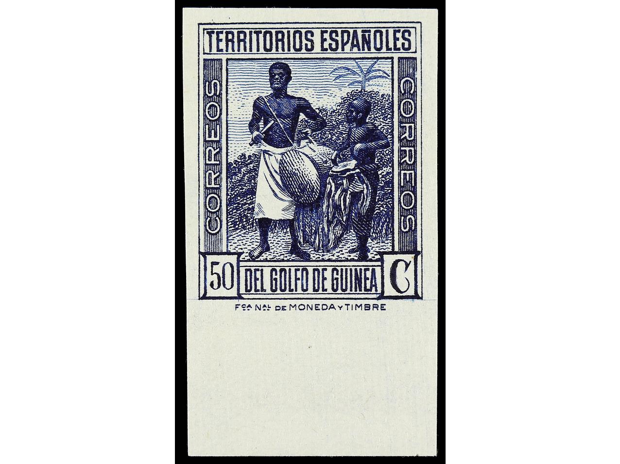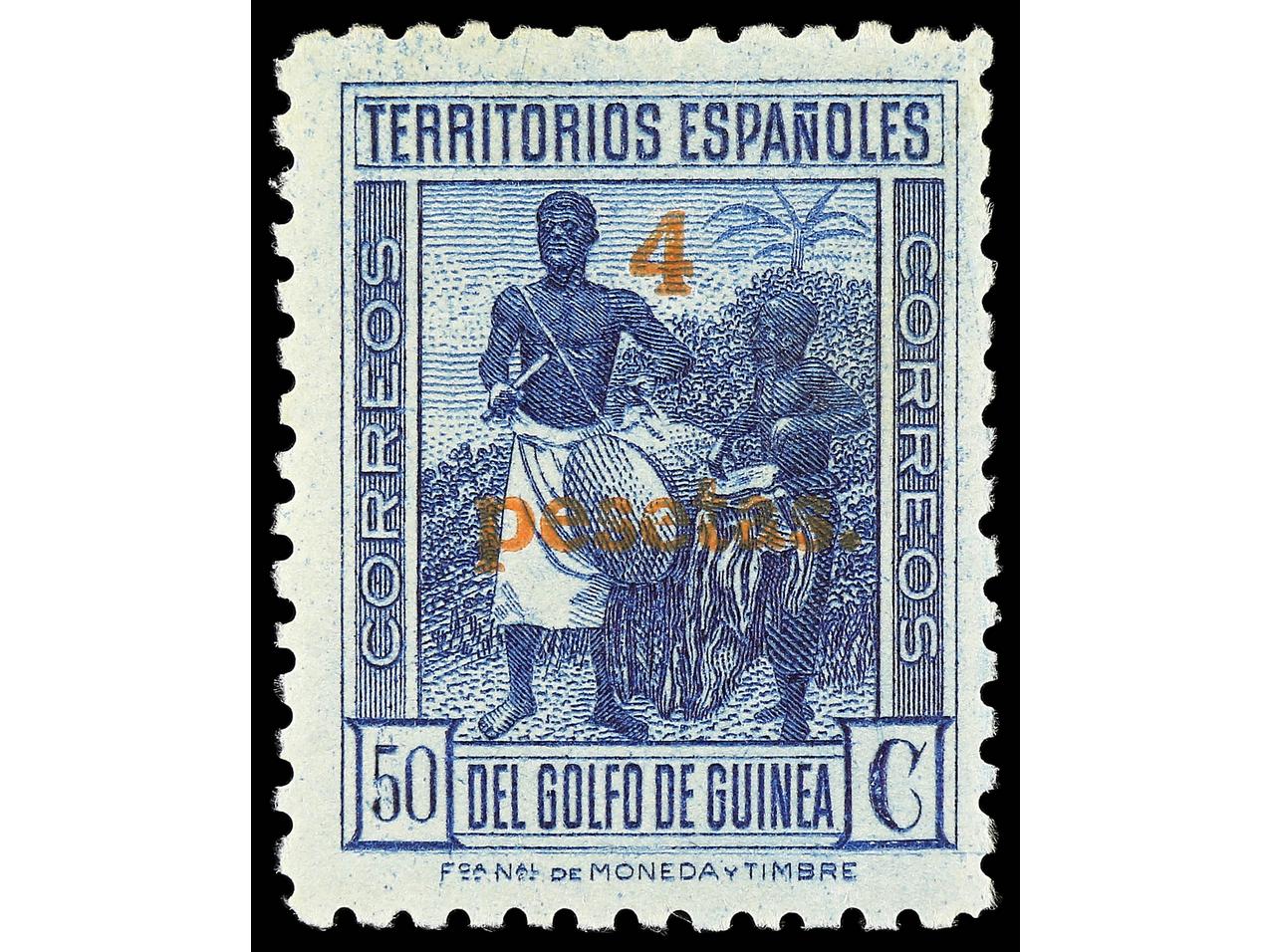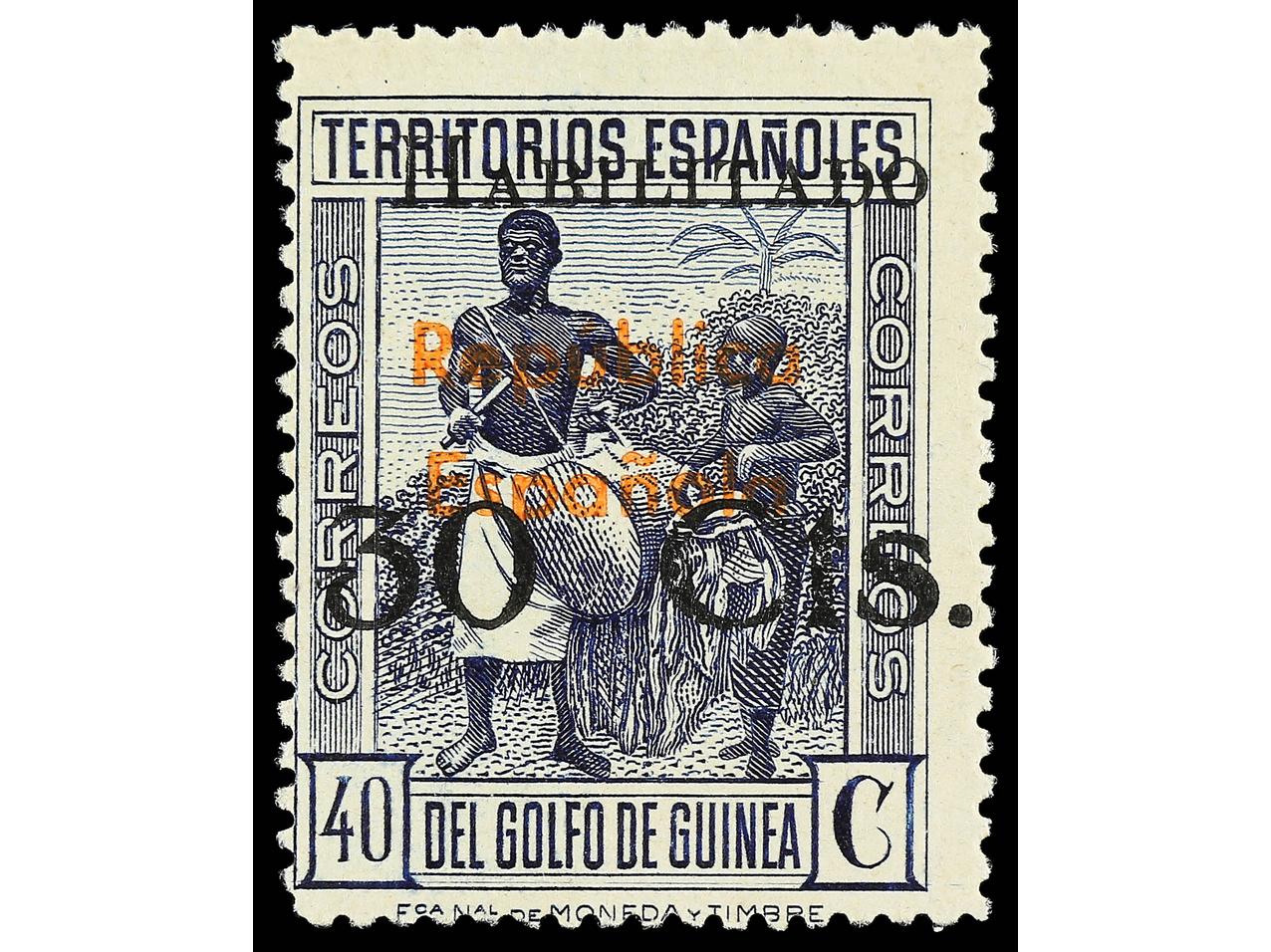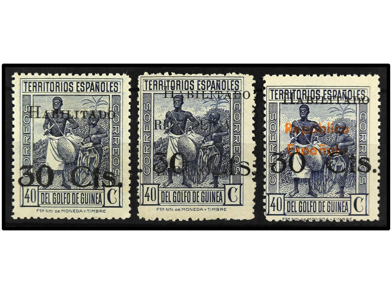 COLONIAS ESPAÑOLAS: GUINEA. JUEGO COMPLETO. 12 valores en parejas con numeración A000,000, un sello variedad ´Españolo´ (uno por hoja). RARÍSIMA VARIEDAD COMBINADA, probablemente ÚNICA. Ed.232M/43N. (Image1) (Image2)