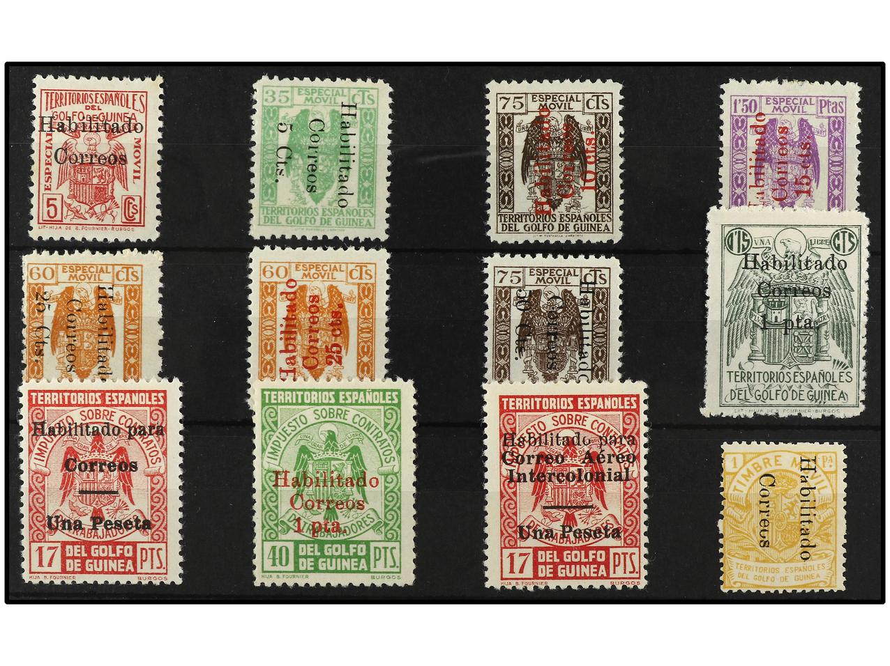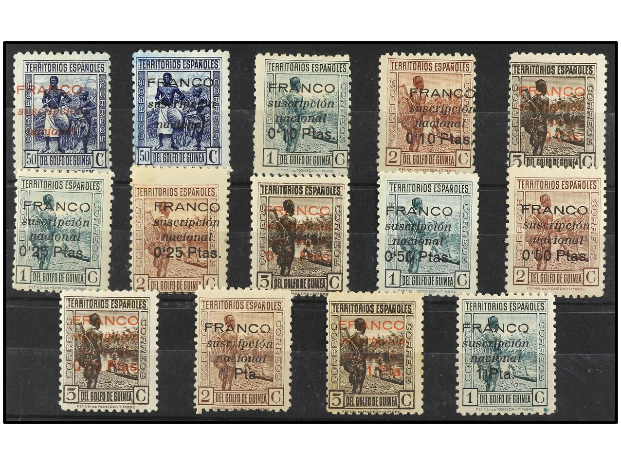 COLONIAS ESPAÑOLAS: GUINEA. LOCALES. SERIES COMPLETAS, 14 valores con habilitación FRANCO SUSCRIPCIÓN NACIONAL. RAROS. Ed.1/12, 13/4. Cat. 650€.