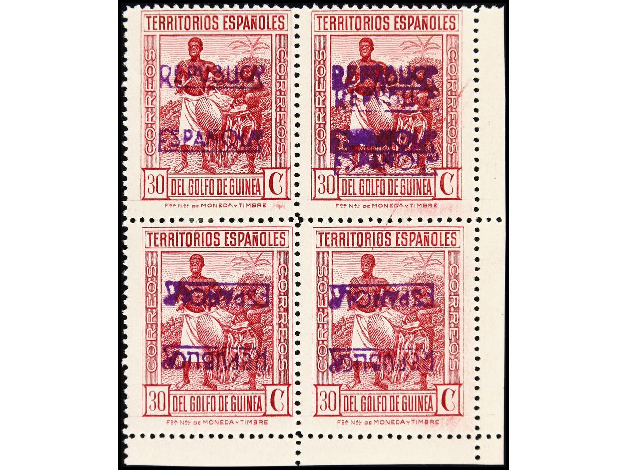 COLONIAS ESPAÑOLAS: GUINEA. 30 cts. carmín. Bloque de cuatro, dos sellos HABILITACIÓN INVERTIDA y un sello DOBLE. RARO. Ed.223Bhi, 223Bhh. (Image1)
