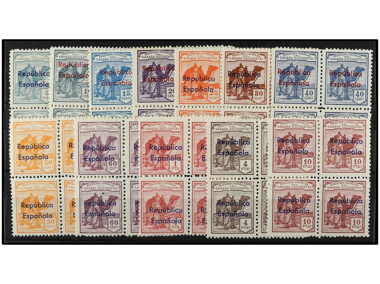 COLONIAS ESPAÑOLAS: SAHARA. SERIE COMPLETA, habilitados de ARRIBA A ABAJO, bloque de cuatro, centrajes habituales. Ed.36A/47A. Cat. 2.520€.
