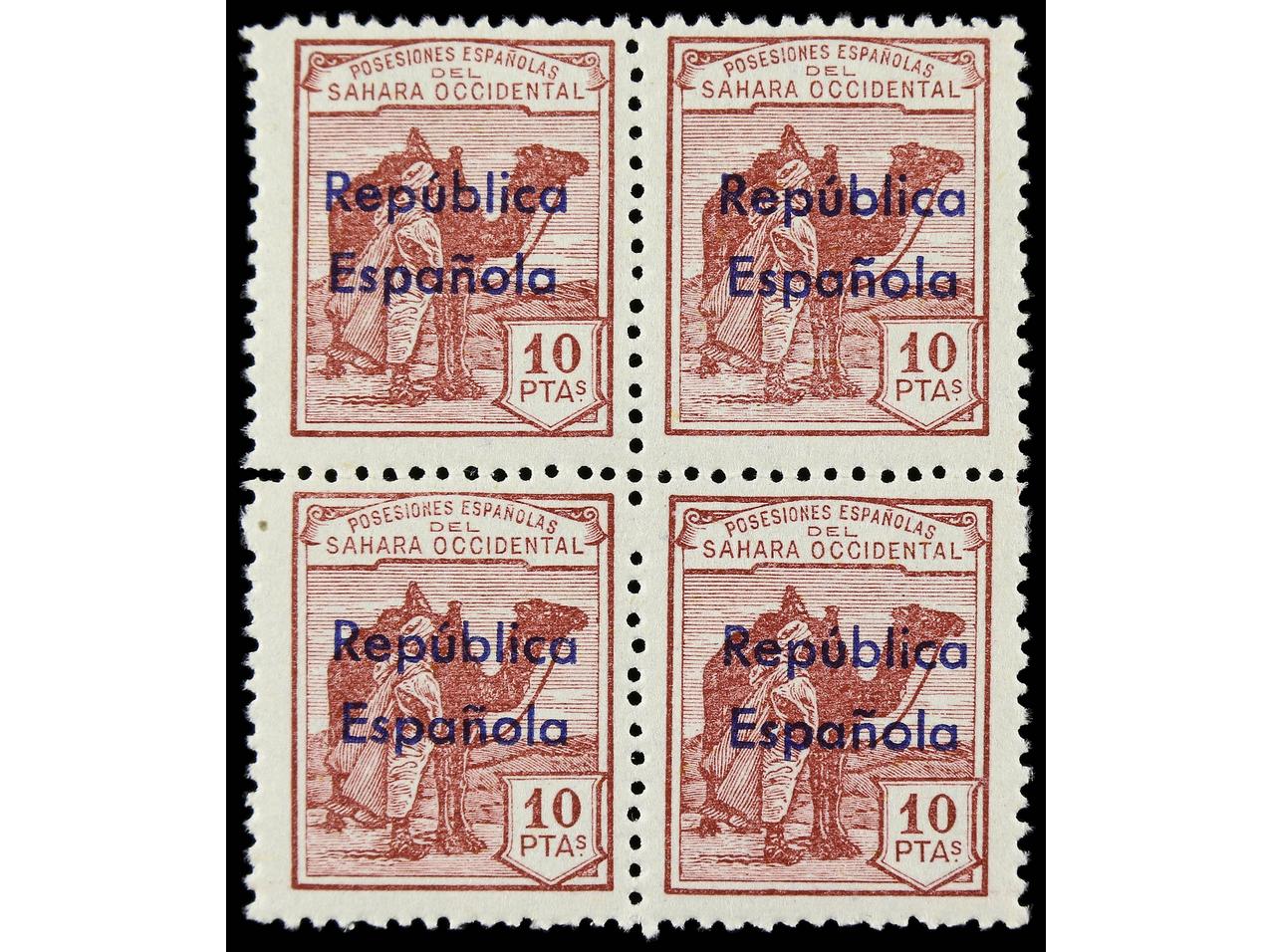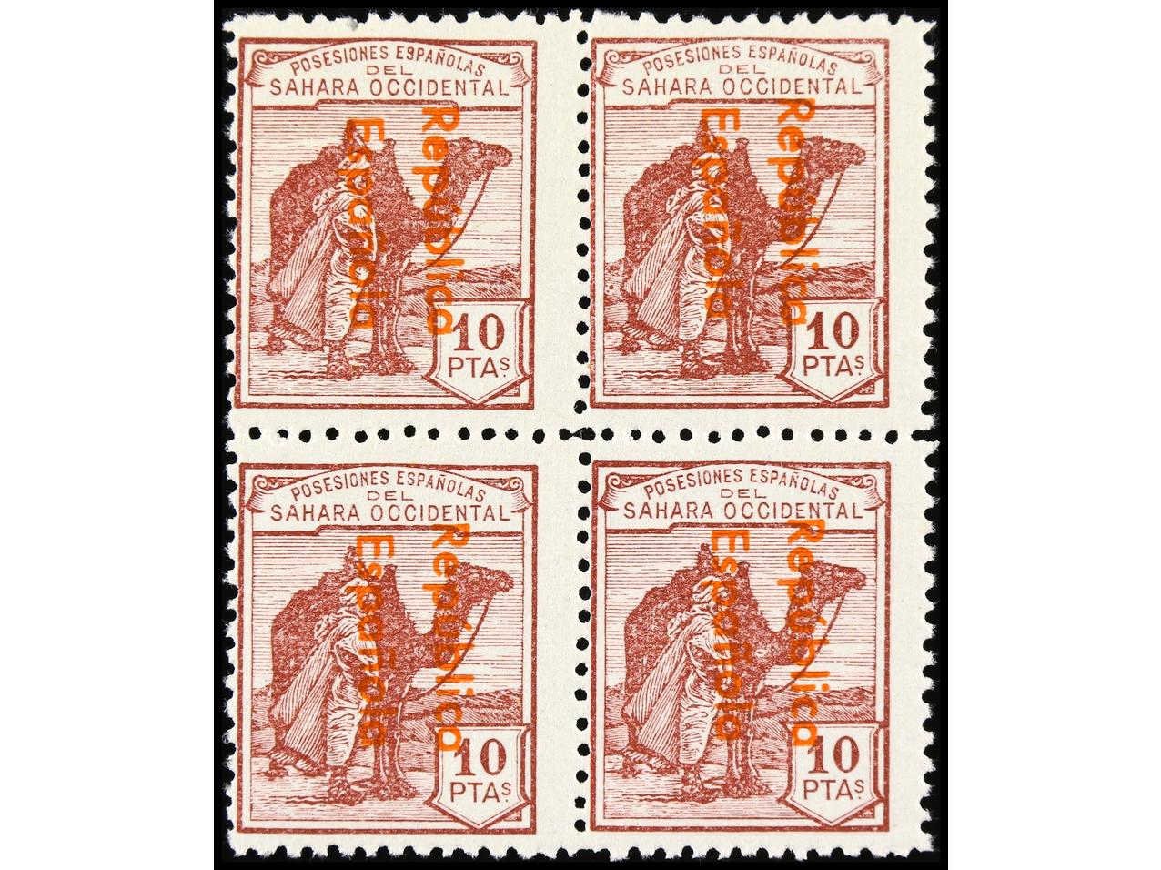 COLONIAS ESPAÑOLAS: SAHARA. SERIE COMPLETA, 10 valores NO EXPENDIDOS. Bloques de cuatro. 1 sello de 10 pts. impureza del papel. Ed.NE 1/10 (4). Cat. +1.540€.