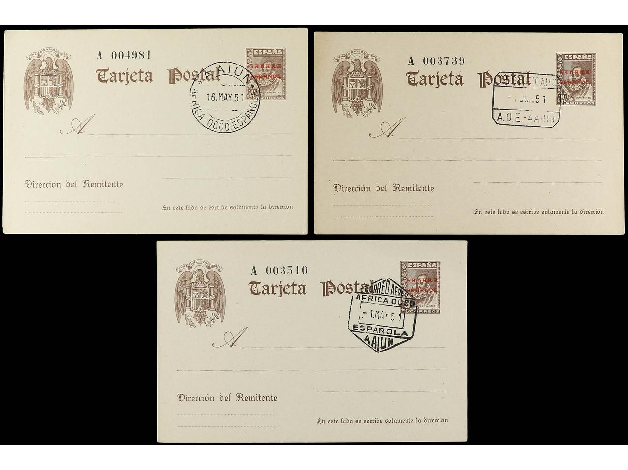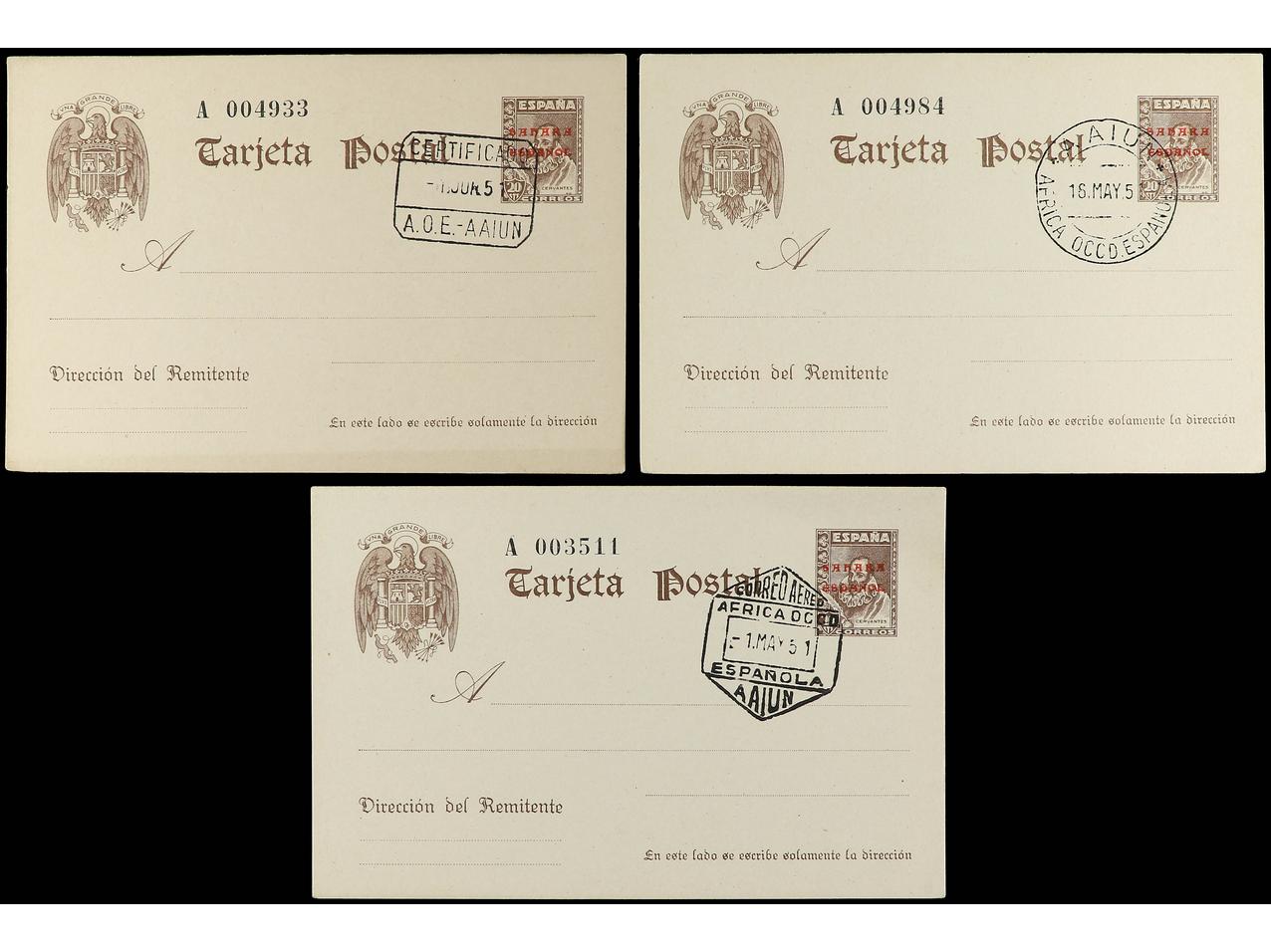 COLONIAS ESPAÑOLAS: SAHARA. 1941. ENTERO POSTAL. Mat. filatélico (MF). 3 ejemplares con distintos matasellos. Foto en web. Ed.1 (3). Cat. 450€.