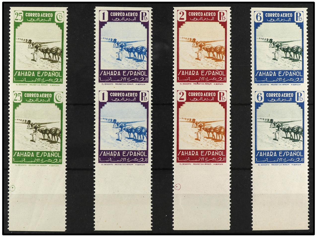 COLONIAS ESPAÑOLAS: SAHARA. JUEGO COMPLETO, 4 valores. 2 cts. y 1, 2 y 4 pts. en parejas verticales SIN DENTADO HORIZONTAL. RAROS y de LUJO. Ed.76/82. Cat. +680€. (Image1) (Image2)