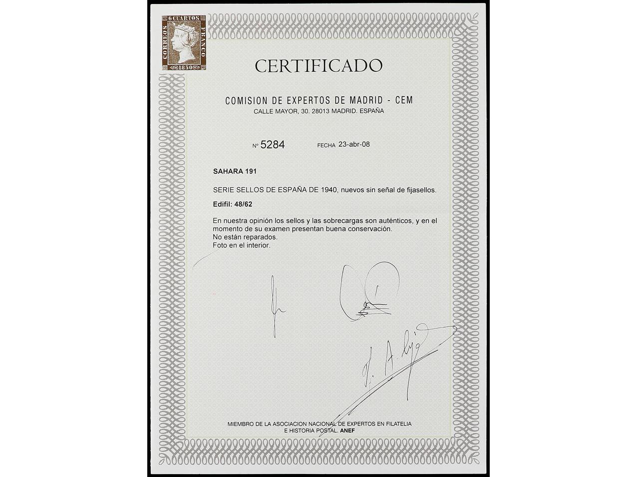COLONIAS ESPAÑOLAS: SAHARA. SERIE COMPLETA. 15 valores. Valor clave muy bien centrado. MUY RARA SIN FIJASELLOS. Cert. CEM. Ed.48/62. Cat. +2.710€.