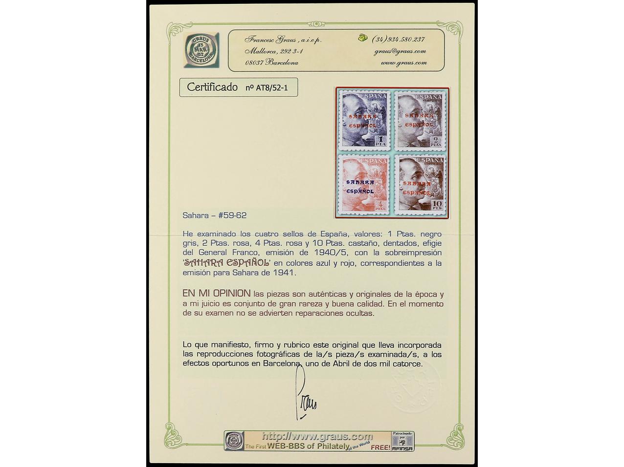 COLONIAS ESPAÑOLAS: SAHARA. SERIE COMPLETA. 15 valores. Valores de 1 pta, 2 pts., 4 pts. y 10 pts. cert. GRAUS. RAROS. Ed.48/62. Cat. 2.055€.