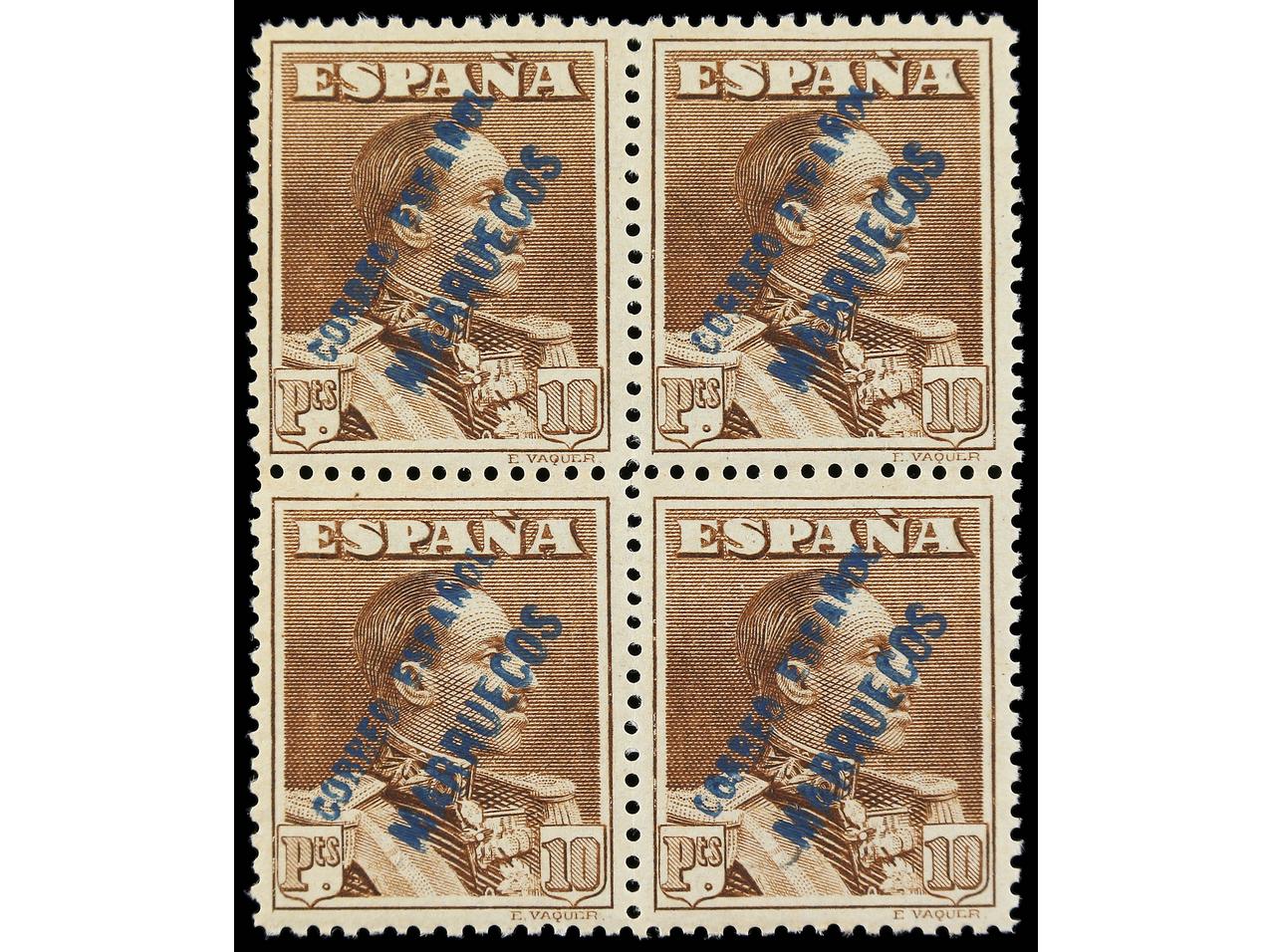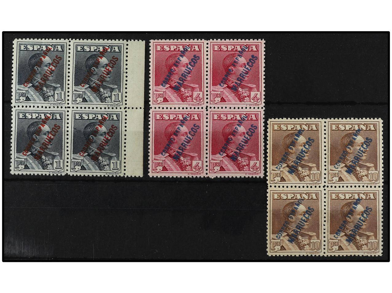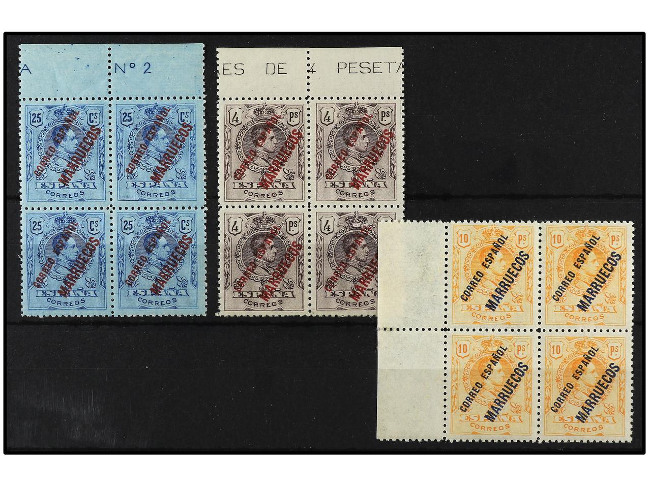 COLONIAS ESPAÑOLAS: TANGER. SERIE COMPLETA, 6 valores en BLOQUES DE CUATRO. 15 c. centrado habitual. Ed.64/9. Cat. 1.660€. (Image1) (Image2)