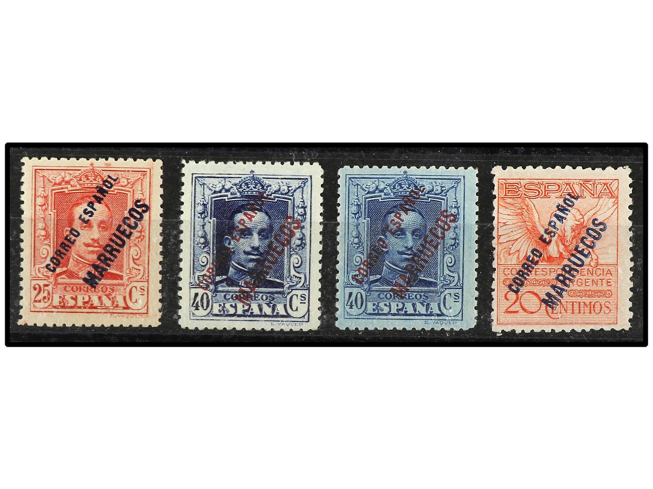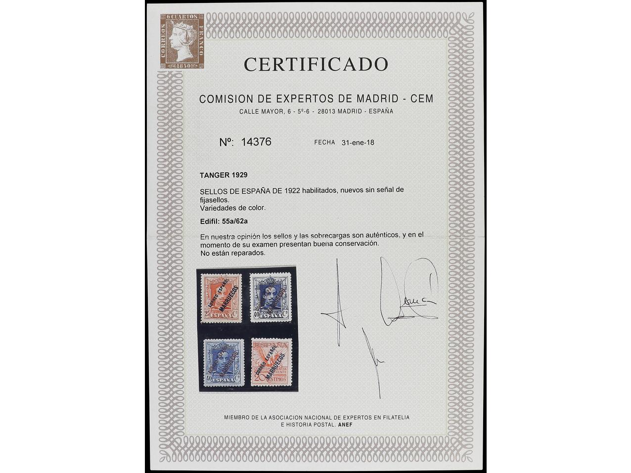 COLONIAS ESPAÑOLAS: TANGER. JUEGO COMPLETO, 4 valores. 25, 40 (2) y 20 c. urgente. VARIEDADES DE COLOR. RARÍSIMOS. Cert.CEM. Ed.55/62a. Cat. +1.362€.