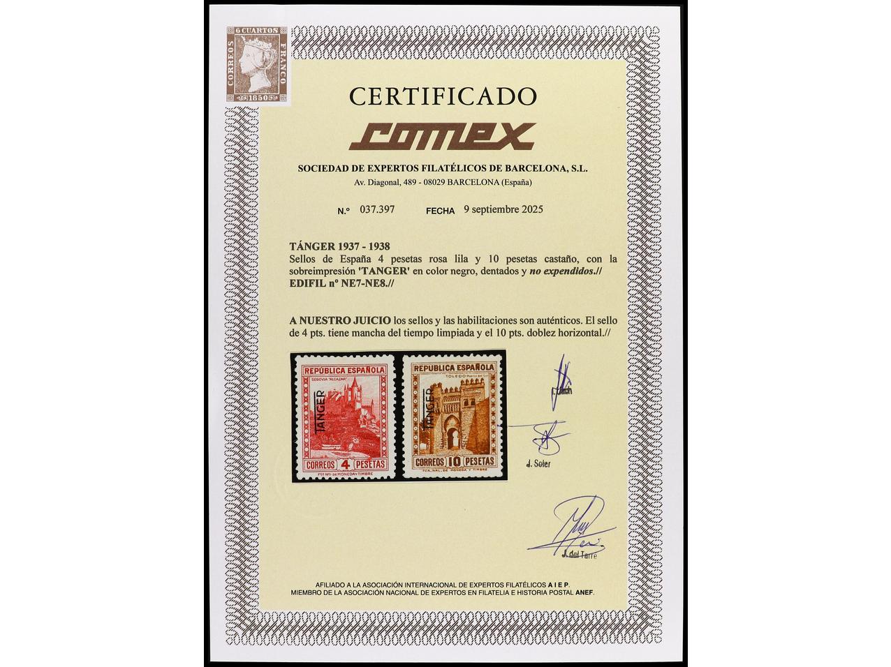 COLONIAS ESPAÑOLAS: TANGER. SERIE COMPLETA, 2 valores NO EXPENDIDOS. RAROS. 4 pts. leve sombra del tiempo y 10 pts. pliegue en margen inferior. Cert. COMEX. Ed.NE 7/8. Cat. 820€. (Image1) (Image2)