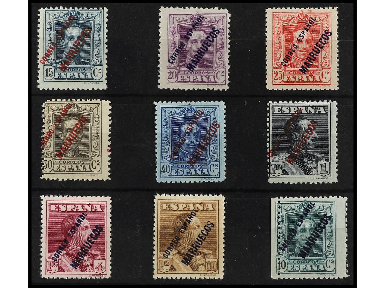 COLONIAS ESPAÑOLAS: TANGER. 10 cts. a 10 pts. sin el 50 cts. 9 valores. Numeración A000,000 correspondientes a la tirada especial para el Congreso de la U.P.U. de Londres. 30 cts. falta diente en esquina. RAROS. Ed.52/61 sin 58. Cat.