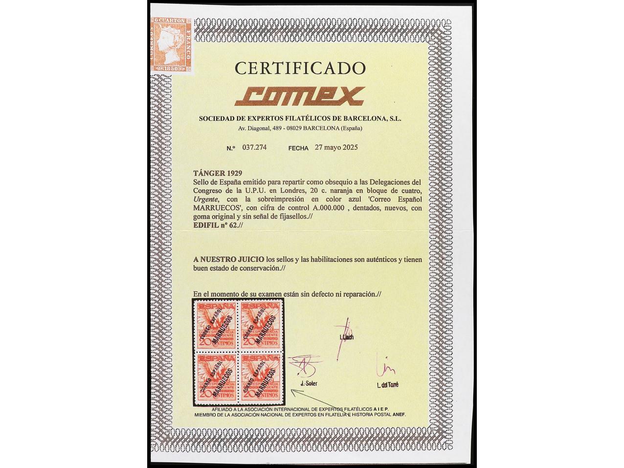 COLONIAS ESPAÑOLAS: TANGER. 20 cts. naranja. PIEZA DE LUJO. RARO. Cert. COMEX (fotocopia del bloque de cuatro de donde procede). Ed.62. Cat. +825€.