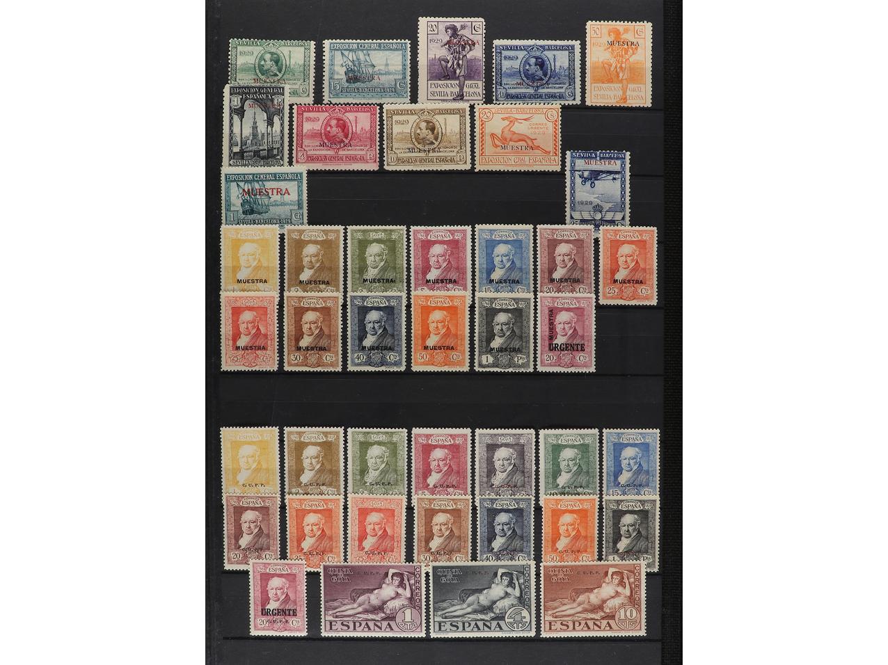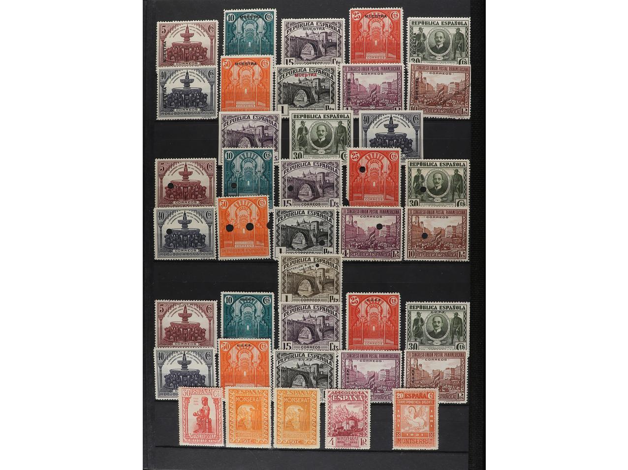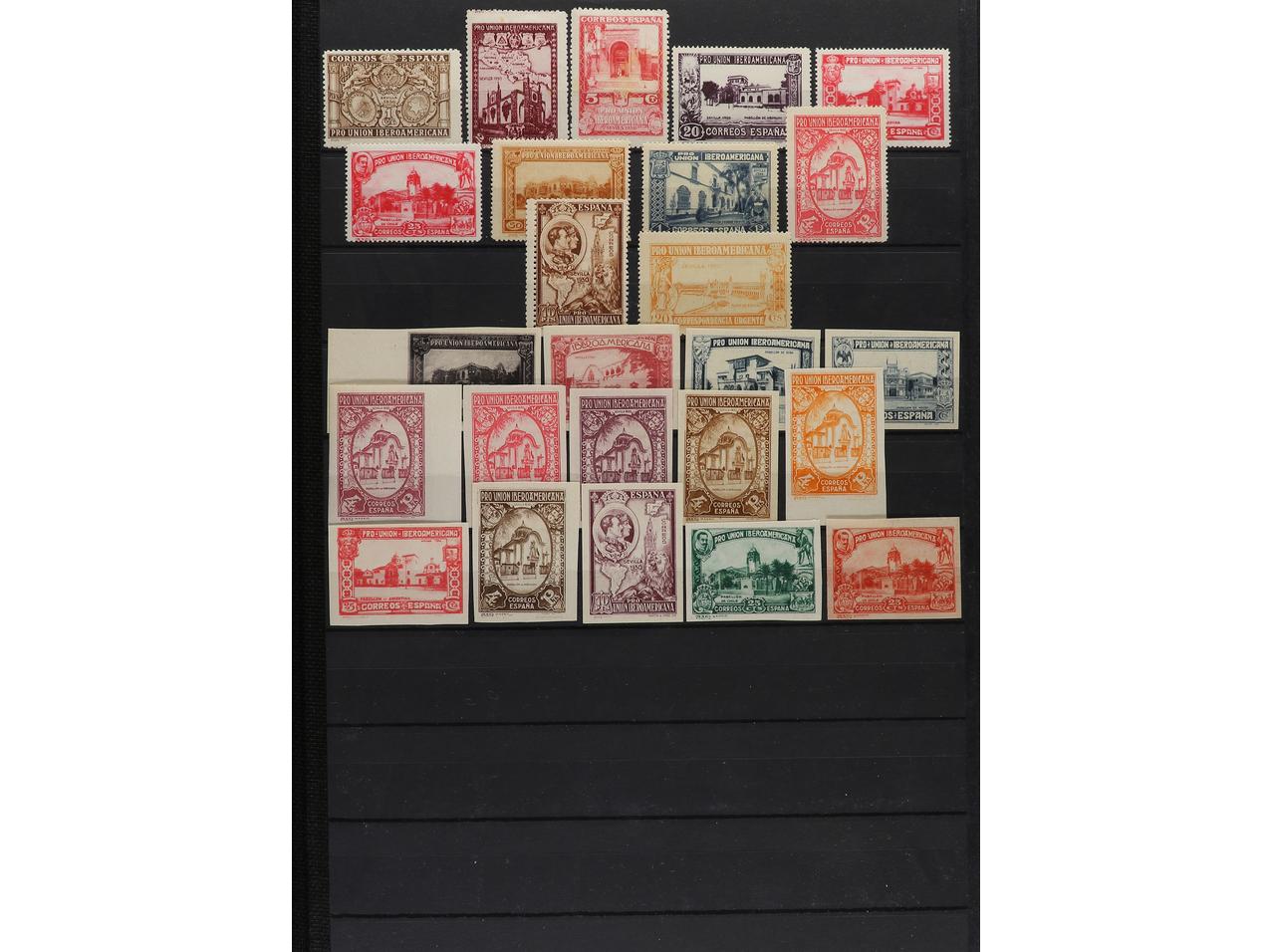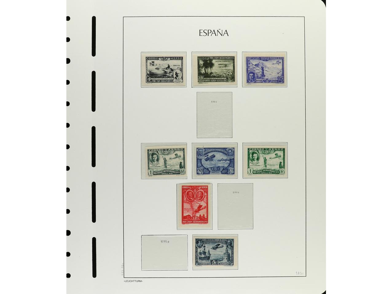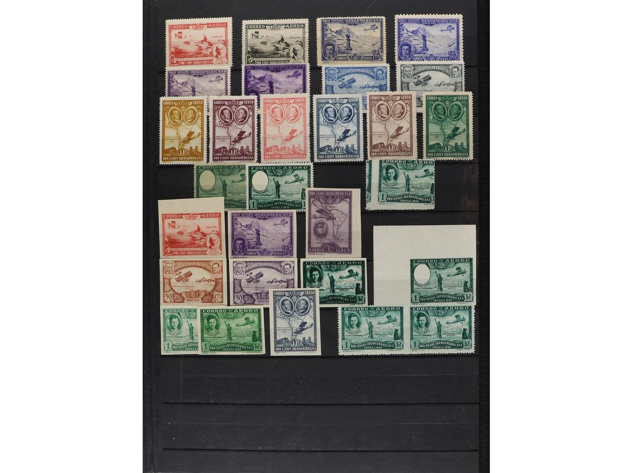 LOTES y COLECCIONES. 1930. ESPAÑA. IBEROAMERICANA. Edifil 566/82 y 583/91. Conjunto montado en hojas de álbum formado por 141 ejemplares con sellos tipo, VARIEDADES DE DENTADO, COLOR, IMPRESIÓN, etc. Algunas no reseñadas. Conjunto muy