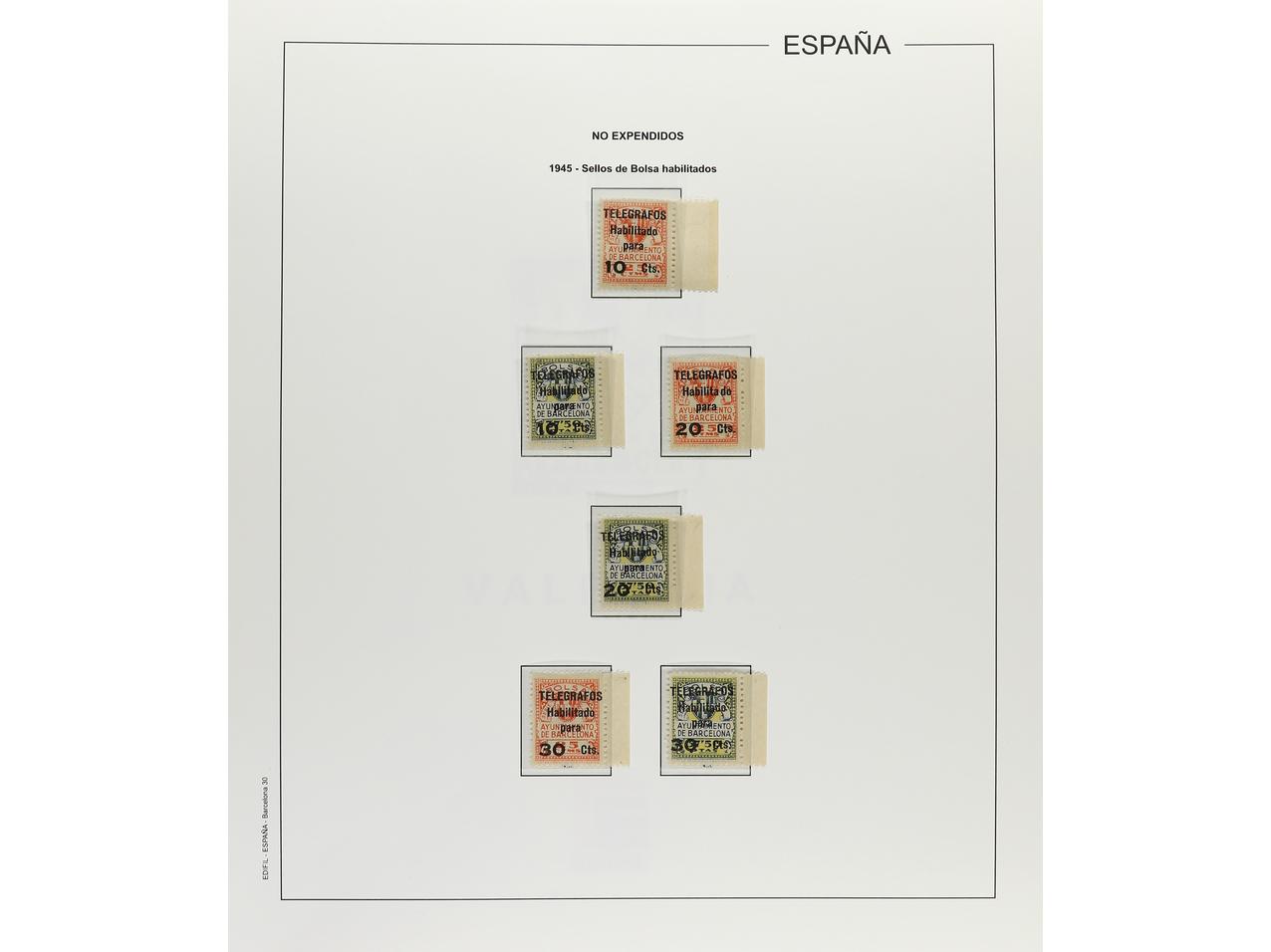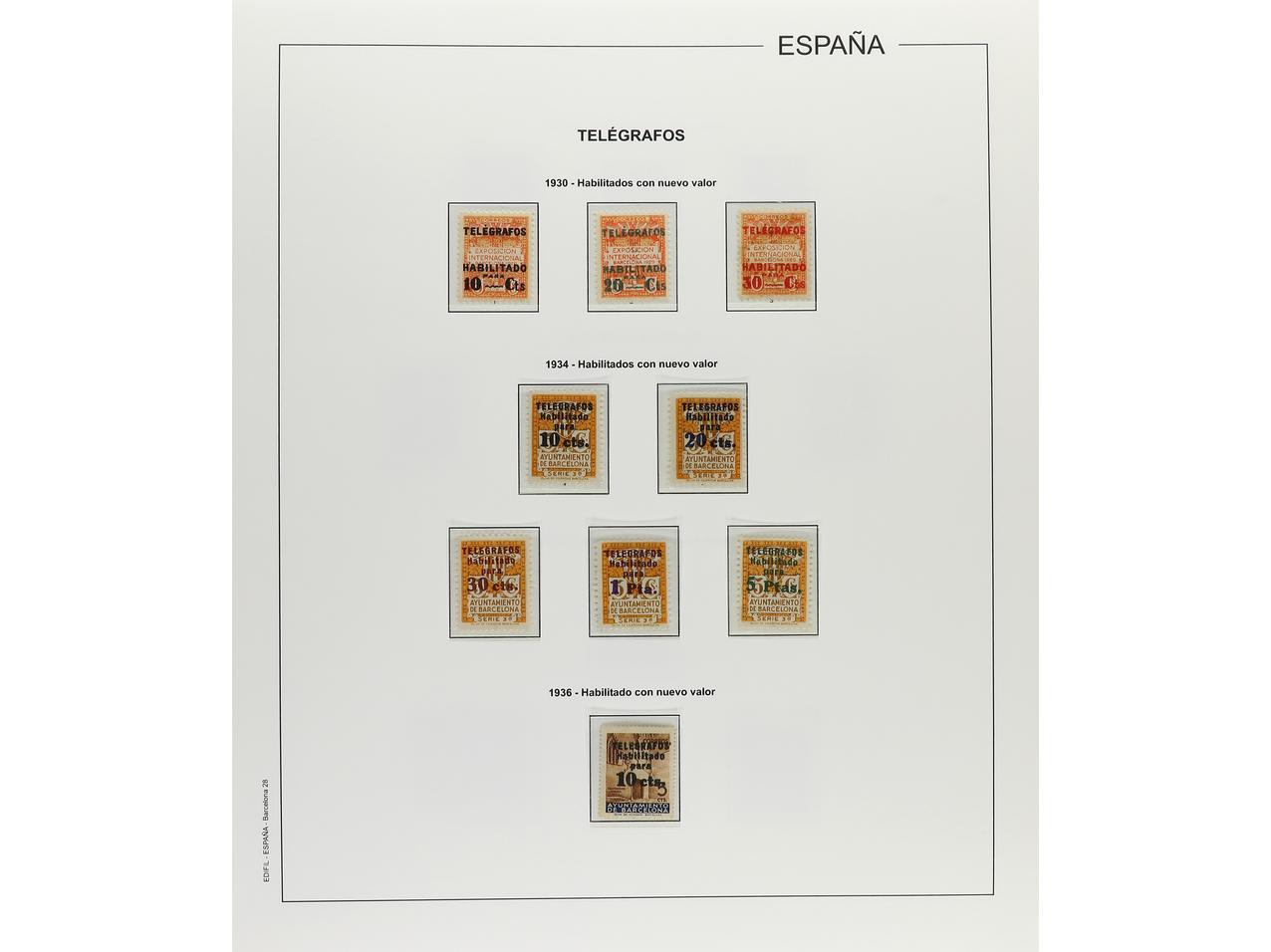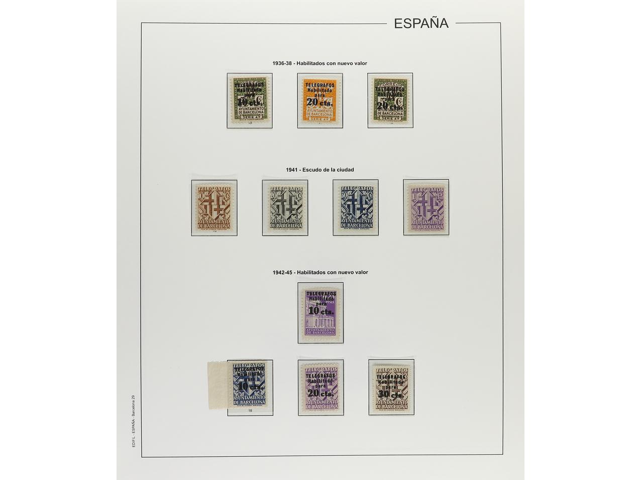 LOTES y COLECCIONES. BARCELONA y ASTURIAS y LEON. Colección en álbum. BARCELONA: Mayoría sin fijasellos, incluyendo los NO EXPENDIDOS. Hojas bloque sin fijasellos, excepto una de poco valor sin goma. Telégrafos, Ed. 20 sin goma. ASTURIAS