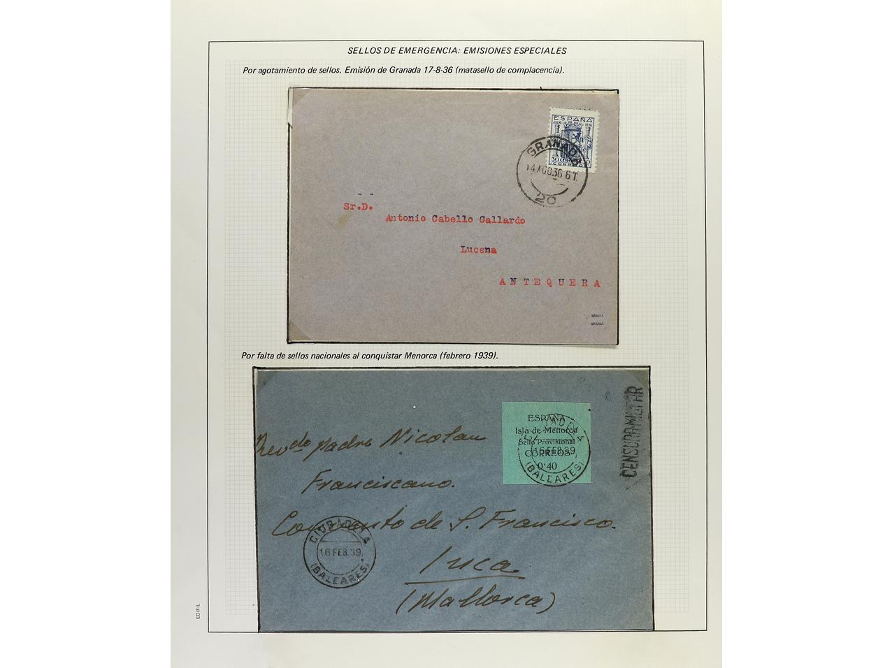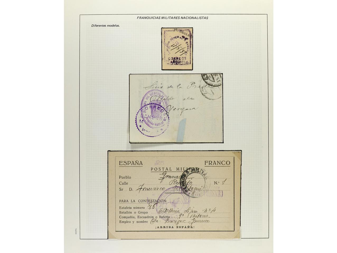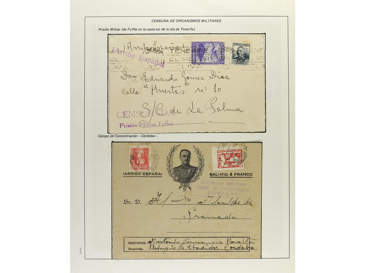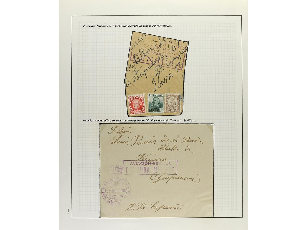 ESPAÑA GUERRA CIVIL. CENSURAS MILITARES. Colección especializada montada en 77 páginas de exposición con descripciones, contiene censuras de ambos bandos, campos de concentración, aviación, Cruz Roja, etc. en general son cartas completas
