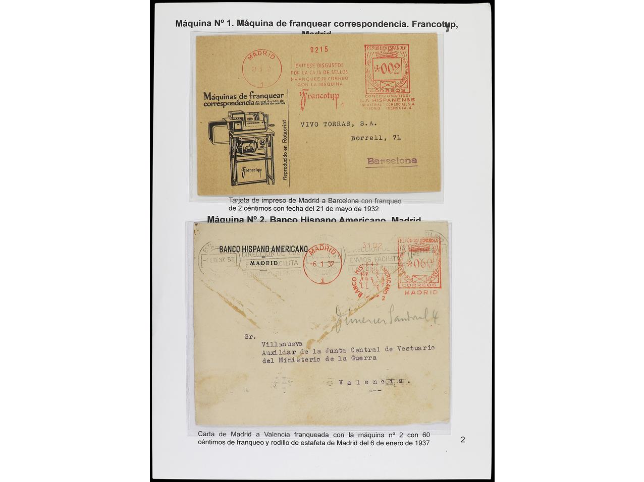 ESPAÑA. 1932-44. FRANQUEO MECÁNICO. Colección especializada montada en hojas de álbum con descripciones, diversos modelos, tarifas, franqueos complementarios. MUY INTERESANTE y RARA, contiene alrededor de 160 cartas. (Image1) (Image2)
