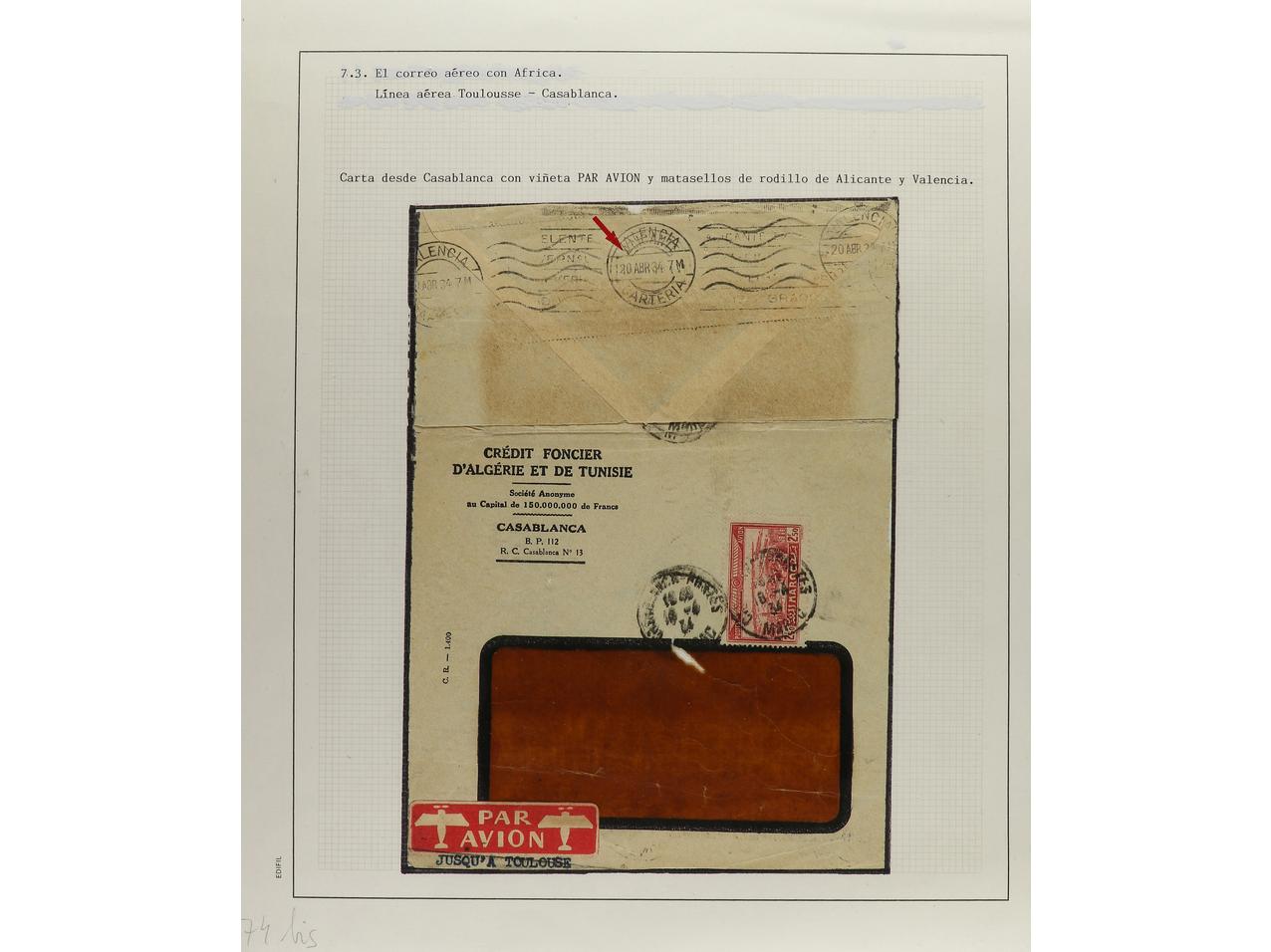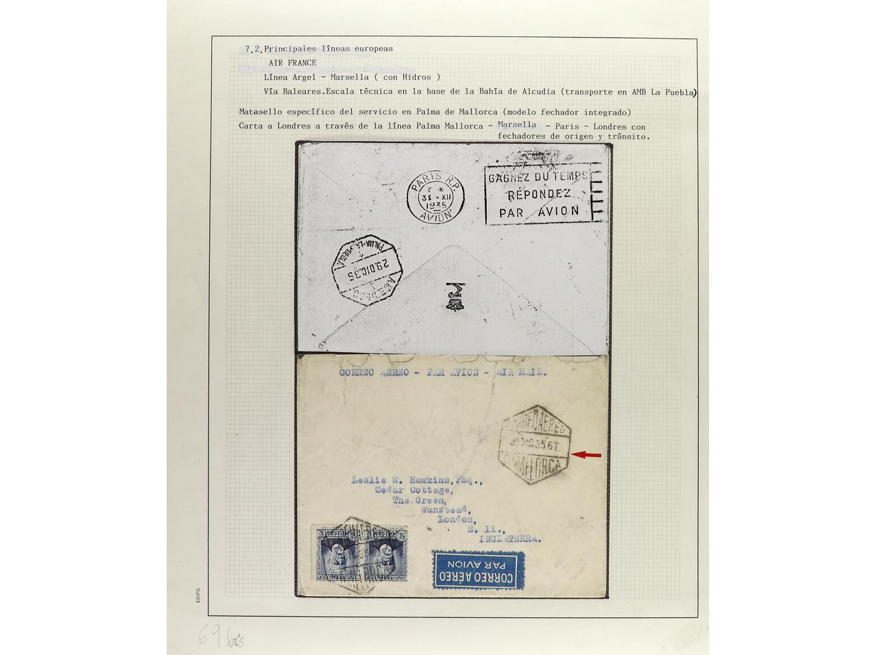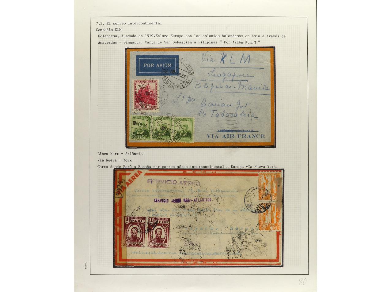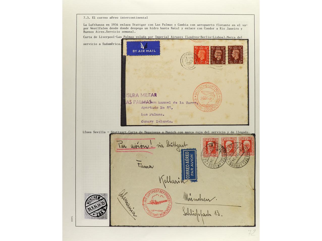ESPAÑA. 1914-1936. CORREO AÉREO. Colección en hojas de exposición con descripciones, contiene un total de 50 cartas más algunos sellos y fragmentos con diversos vuelos, algunos del norte de África. CONJUNTO MUY INTERESANTE QUE MERECE