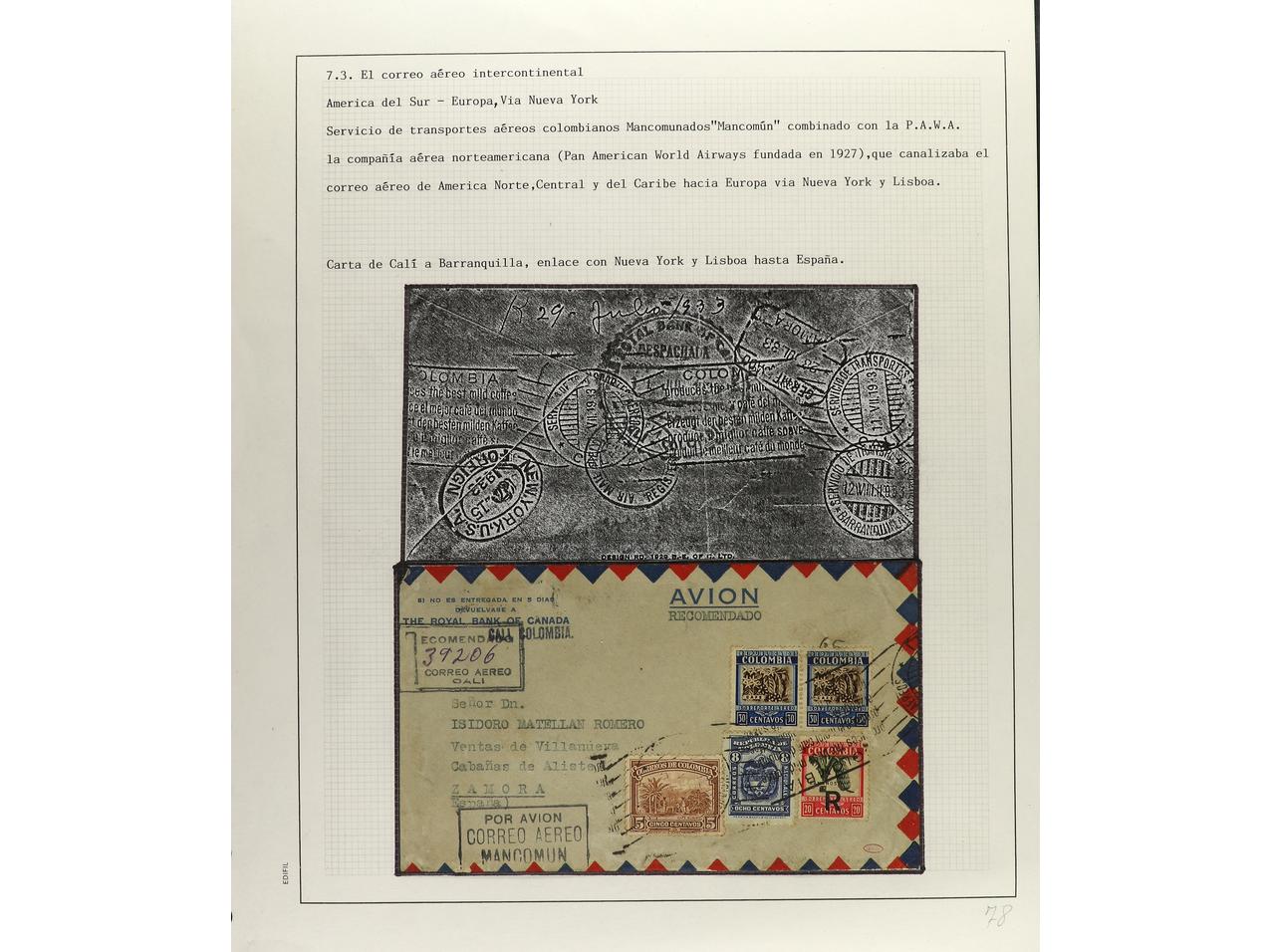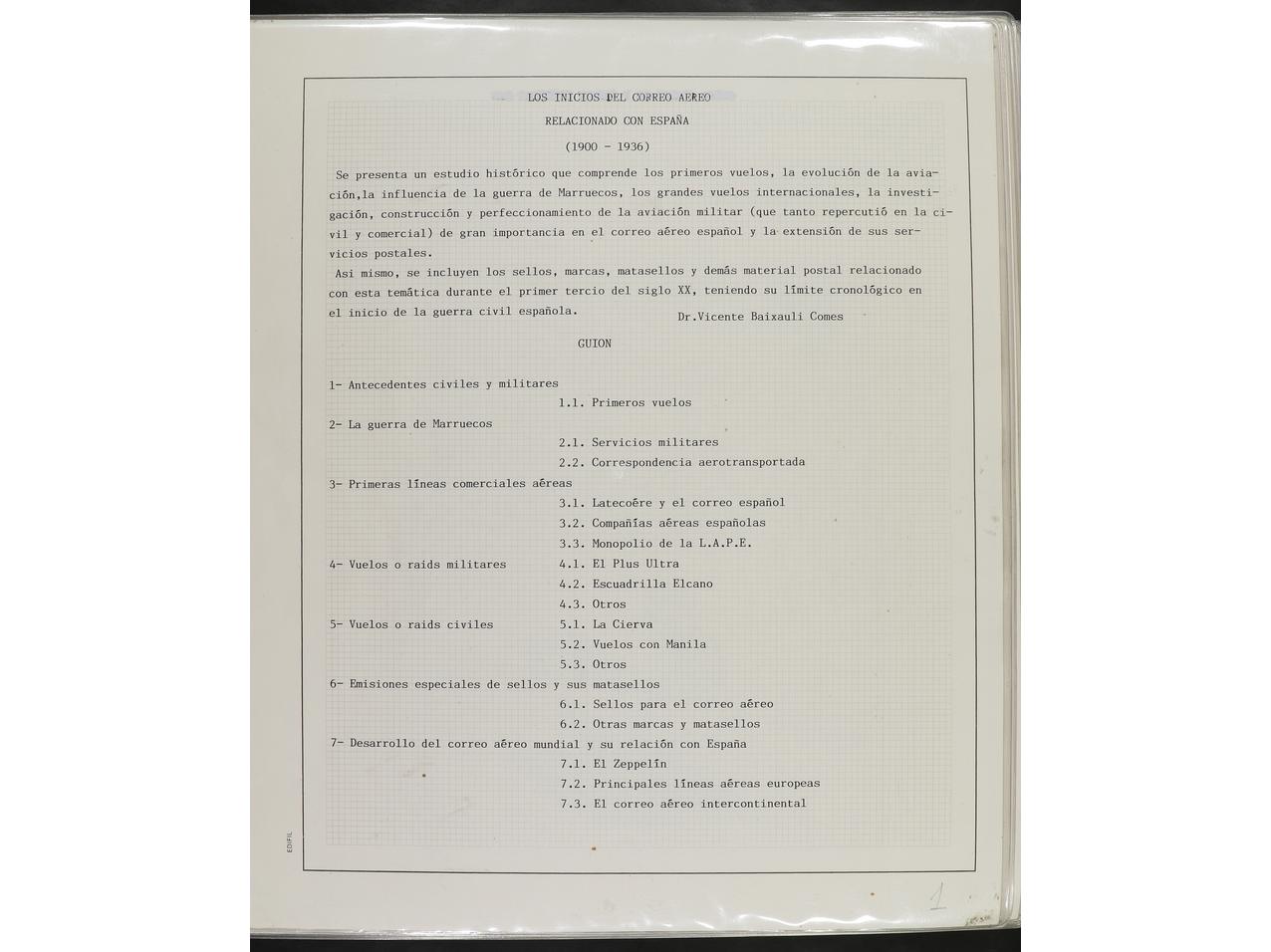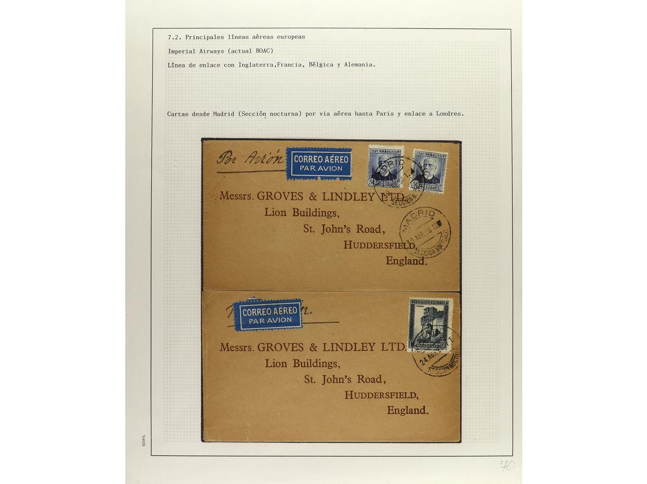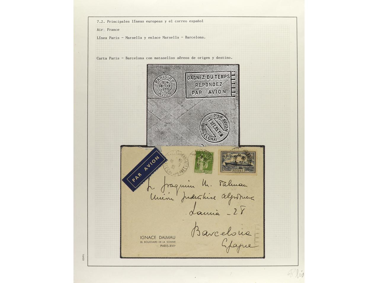 ESPAÑA. 1914-1936. CORREO AÉREO. Colección en hojas de exposición con descripciones, contiene un total de 50 cartas más algunos sellos y fragmentos con diversos vuelos, algunos del norte de África. CONJUNTO MUY INTERESANTE QUE MERECE