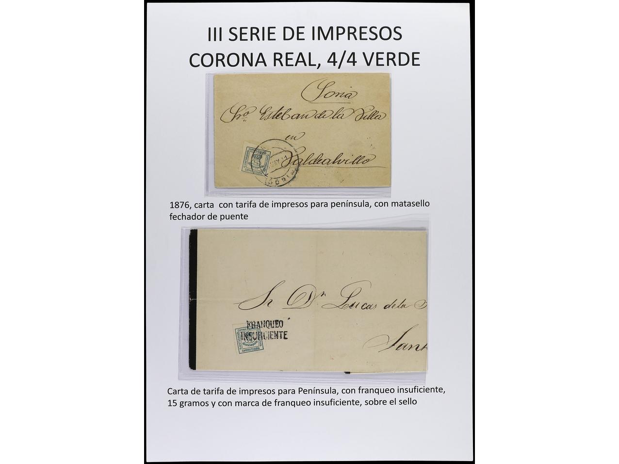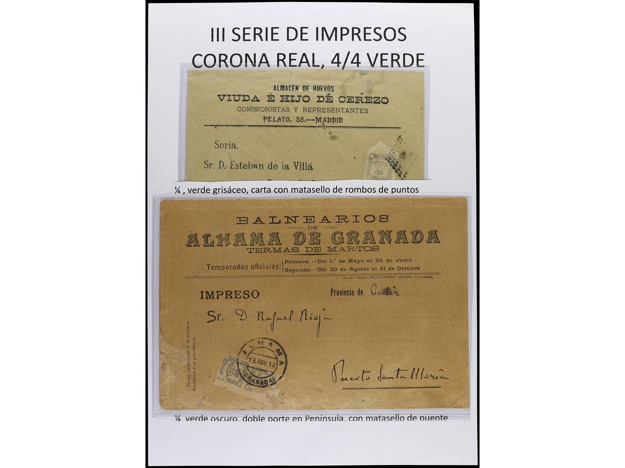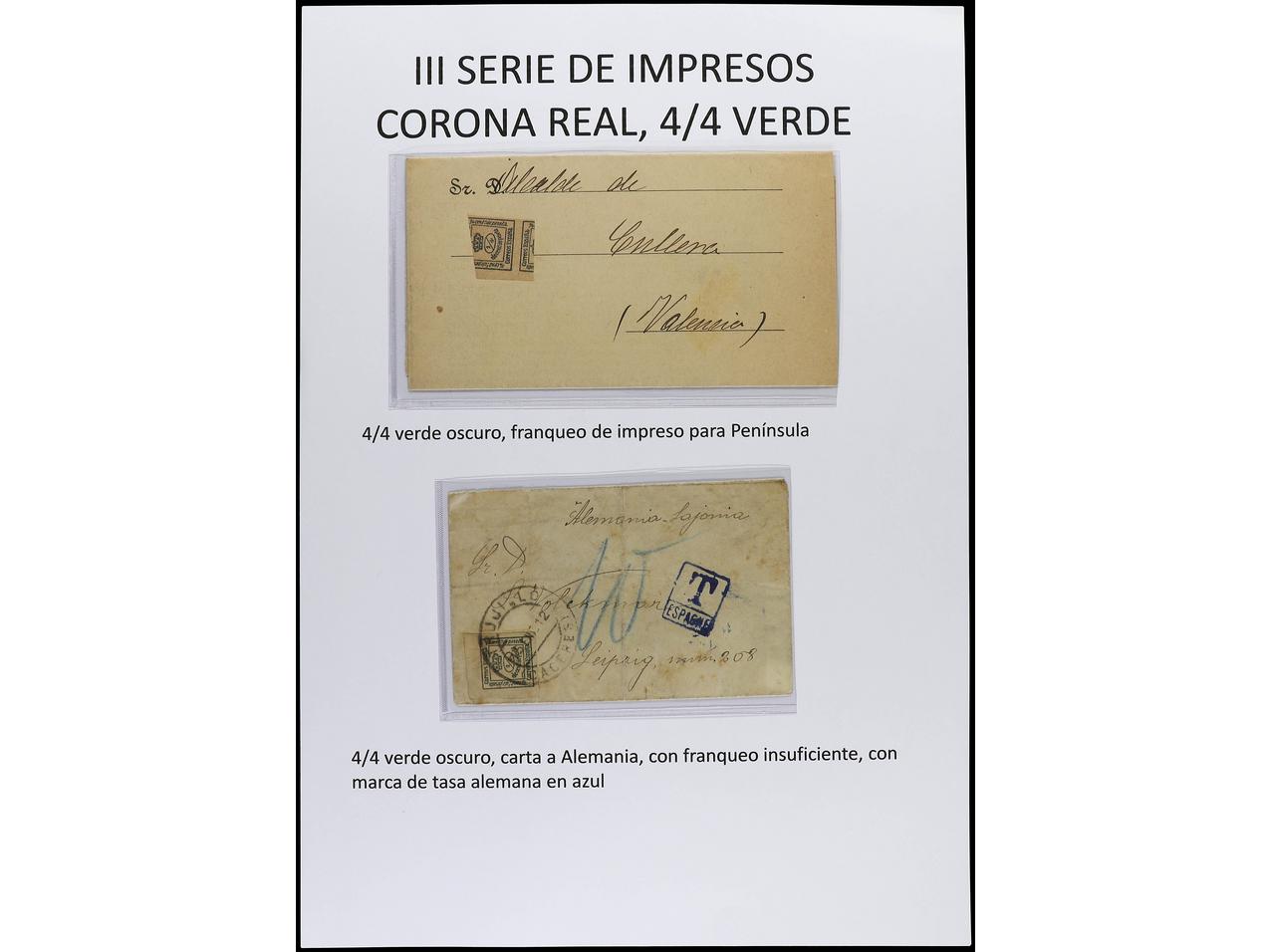 ESPAÑA. 1872-1900. En páginas de álbum del sello de 1/4 de cto. azul y verde en cartas con diversos franqueos. (Image1) (Image2)