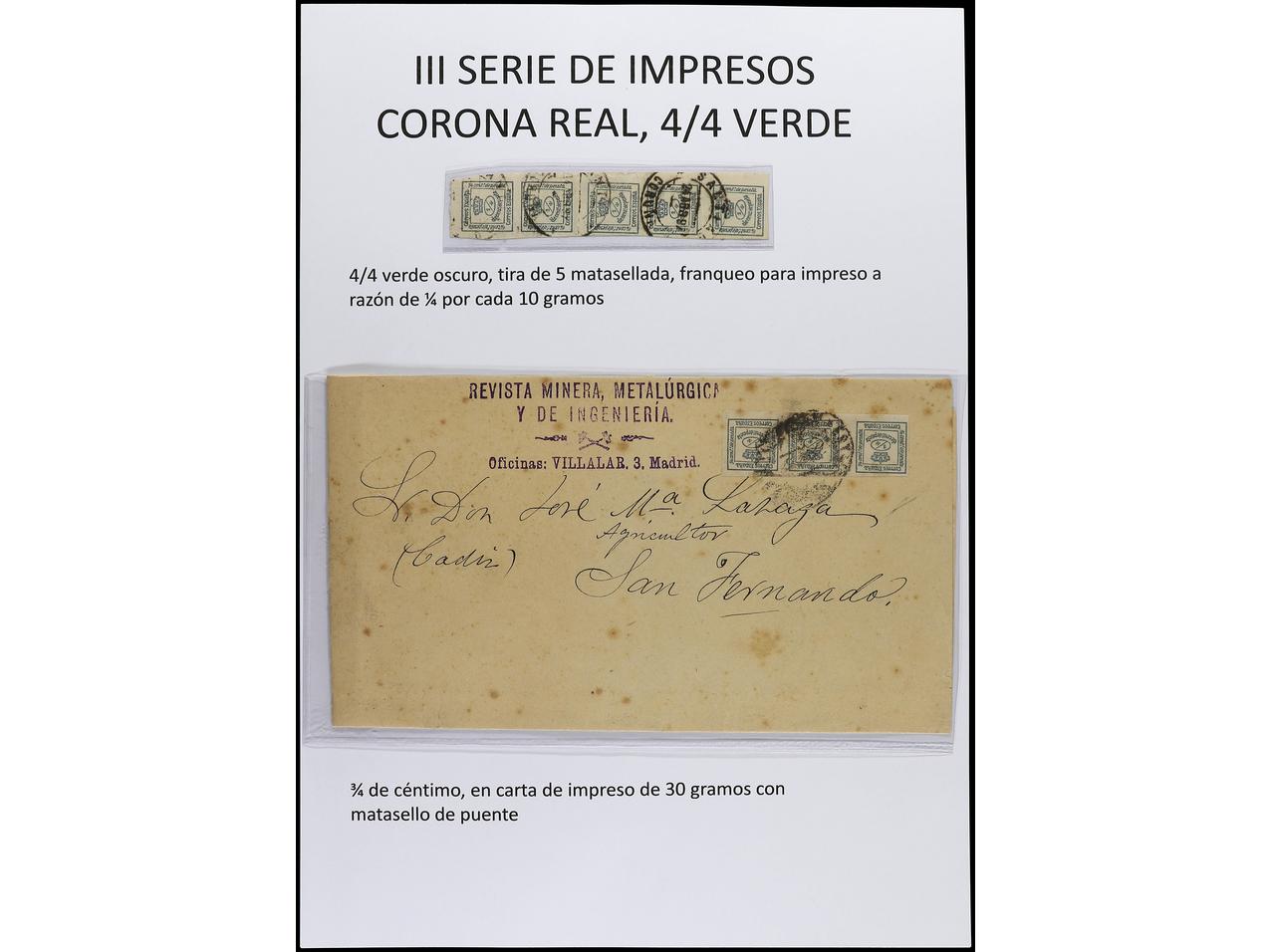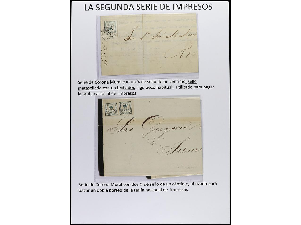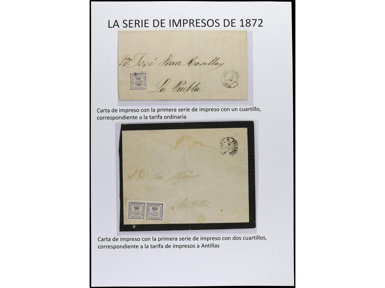 ESPAÑA. 1872-1900. En páginas de álbum del sello de 1/4 de cto. azul y verde en cartas con diversos franqueos. (Image1) (Image2)