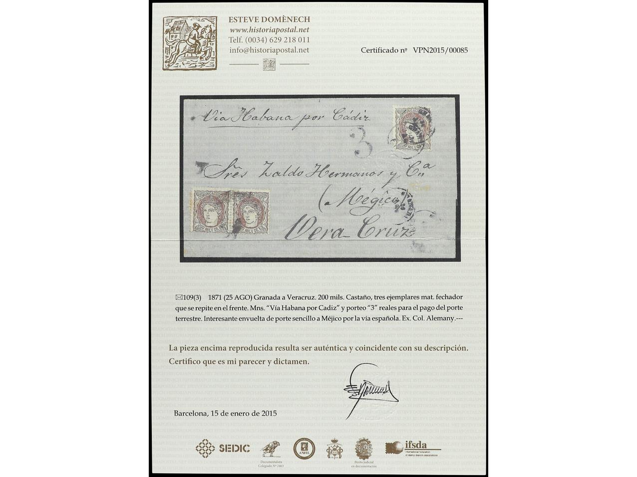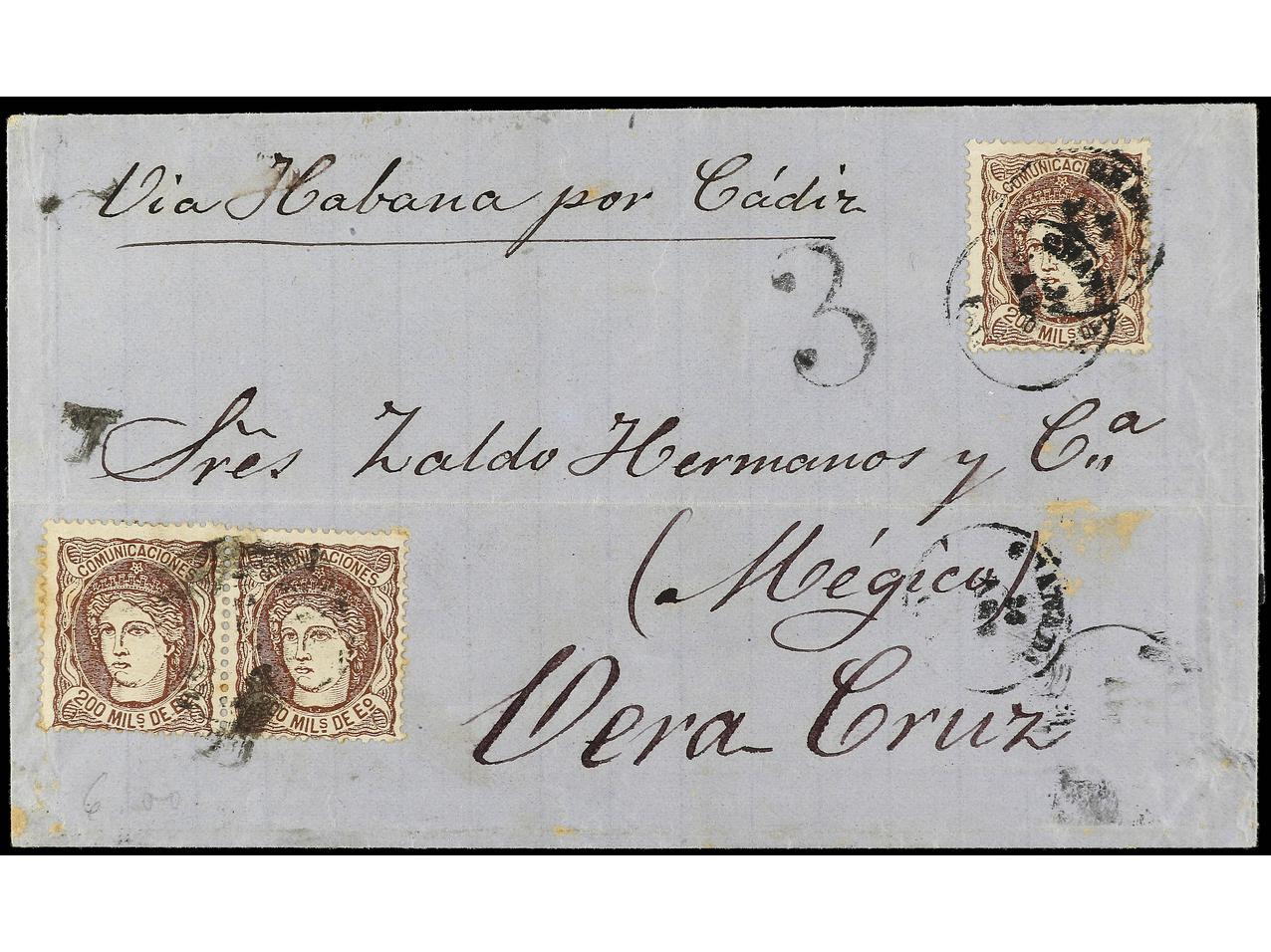 ESPAÑA. 1871. GRANADA a VERACRUZ (México). 200 mils. castaño (3). Porte simple por la vía Española. RARA. Ed.109 (3). (Image1) (Image2)