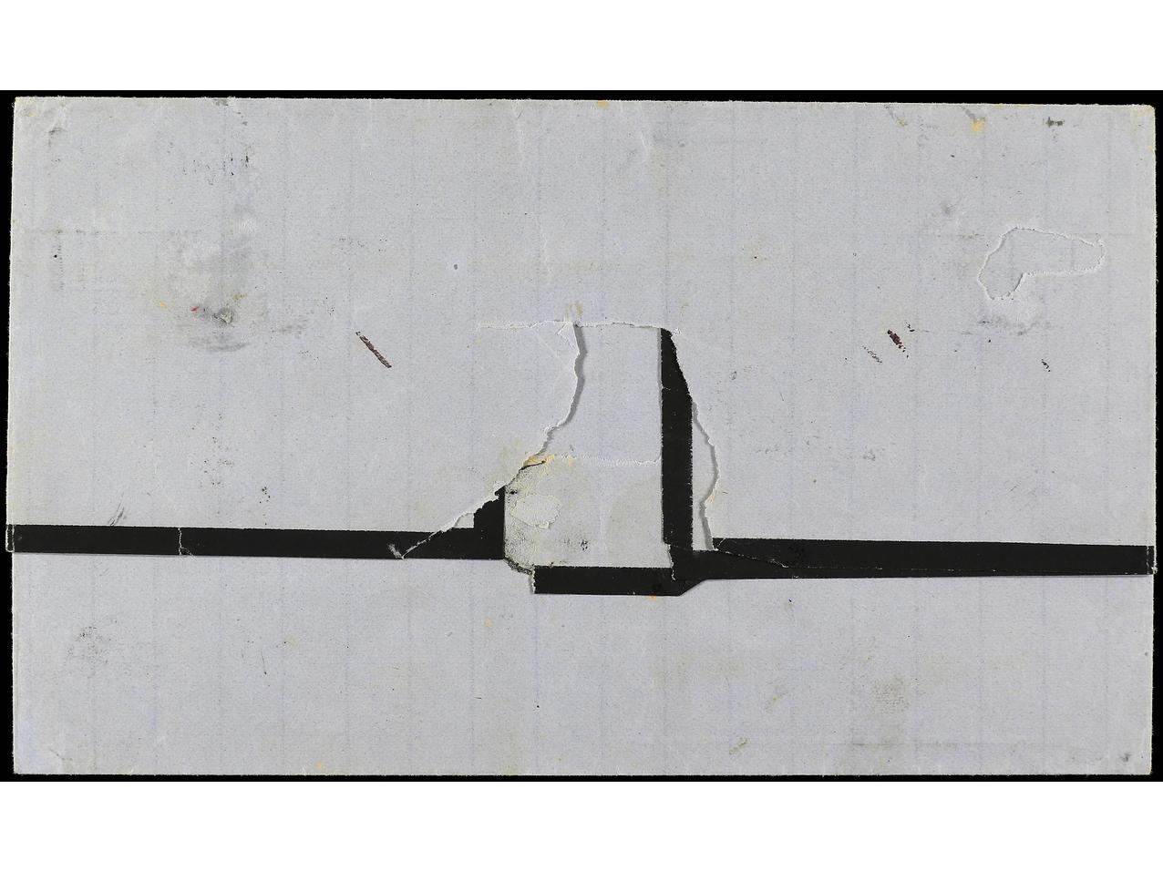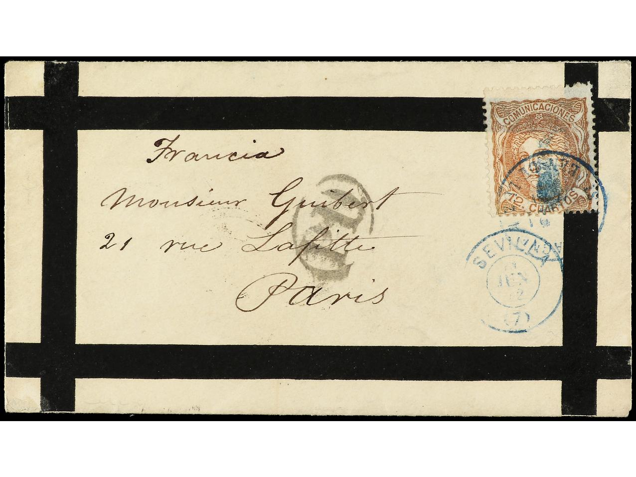 ESPAÑA. 1872. SEVILLA a PARÍS. 12 cuartos castaño. Sobre mecánico de luto. Raro en época tan temprana. Ed.113. (Image1) (Image2)