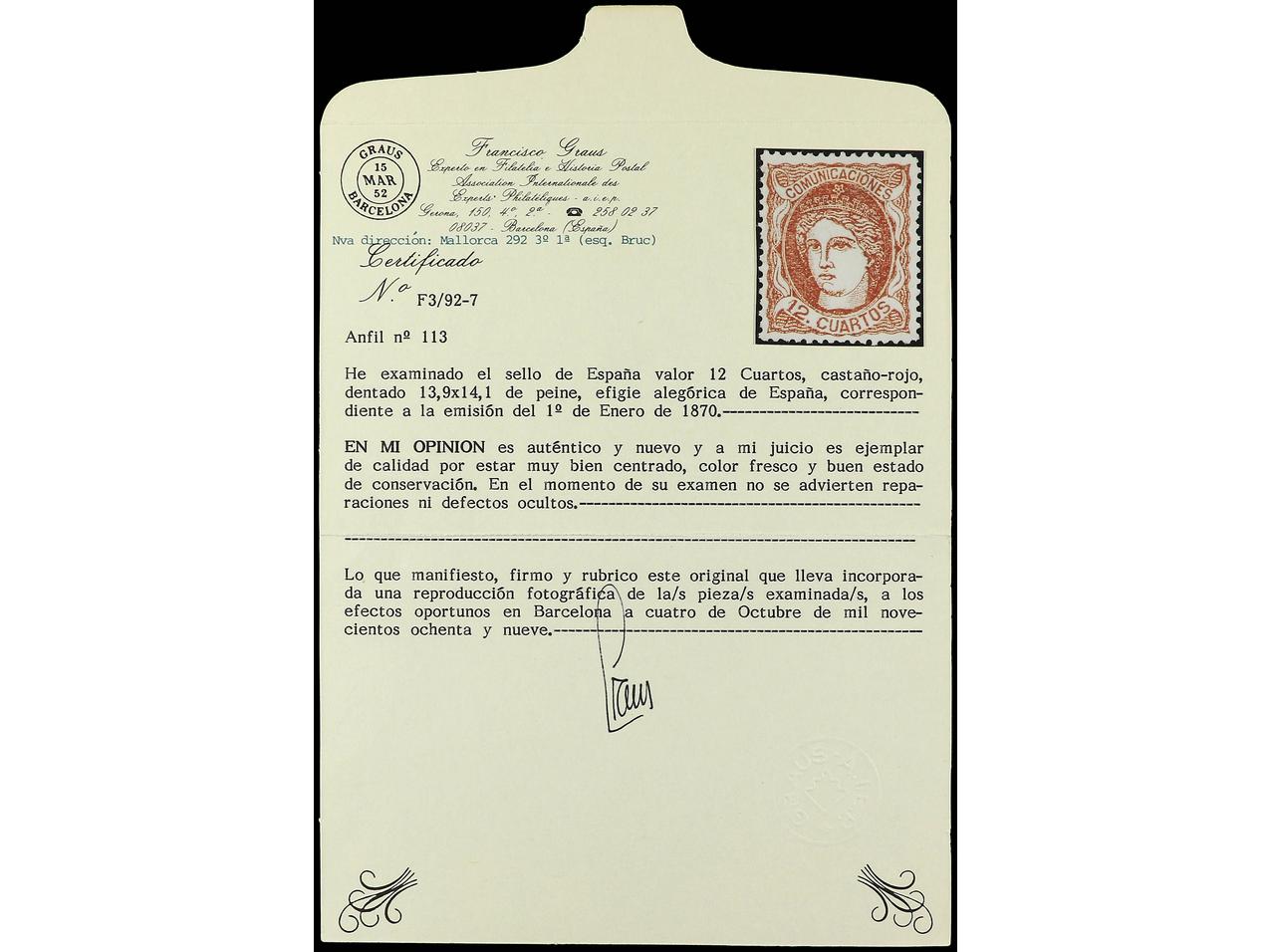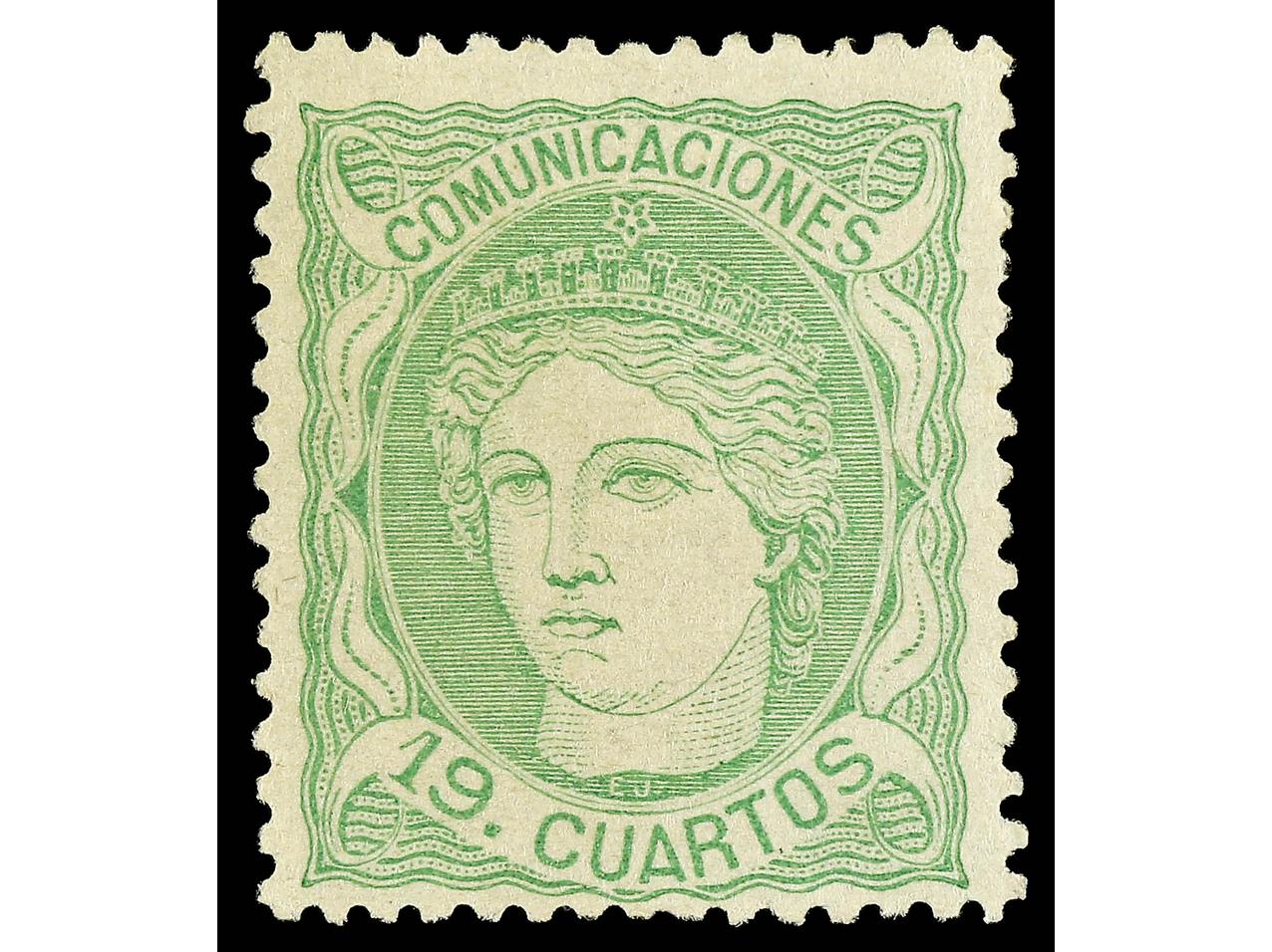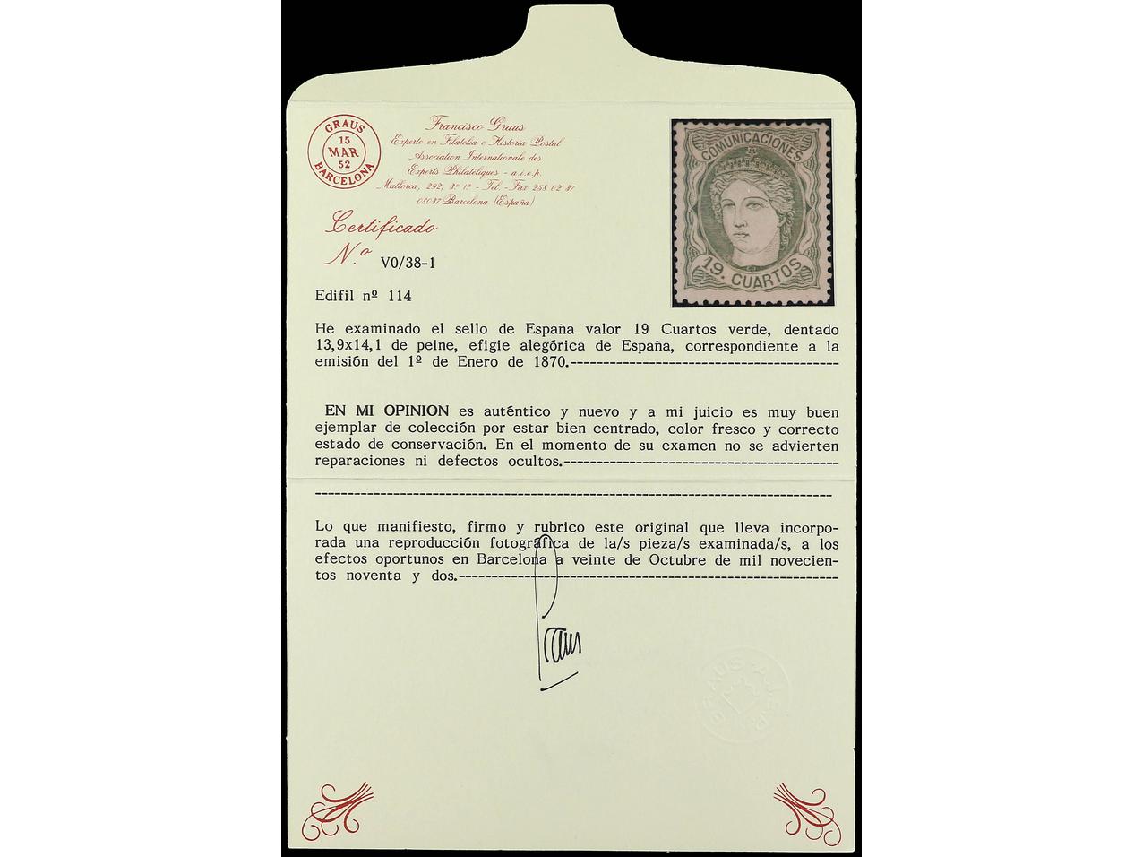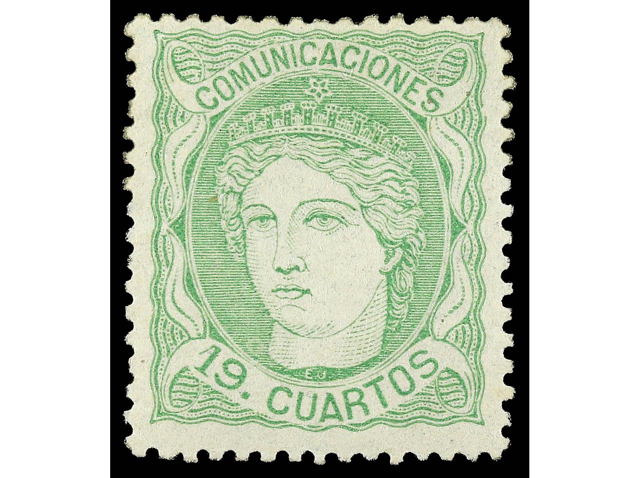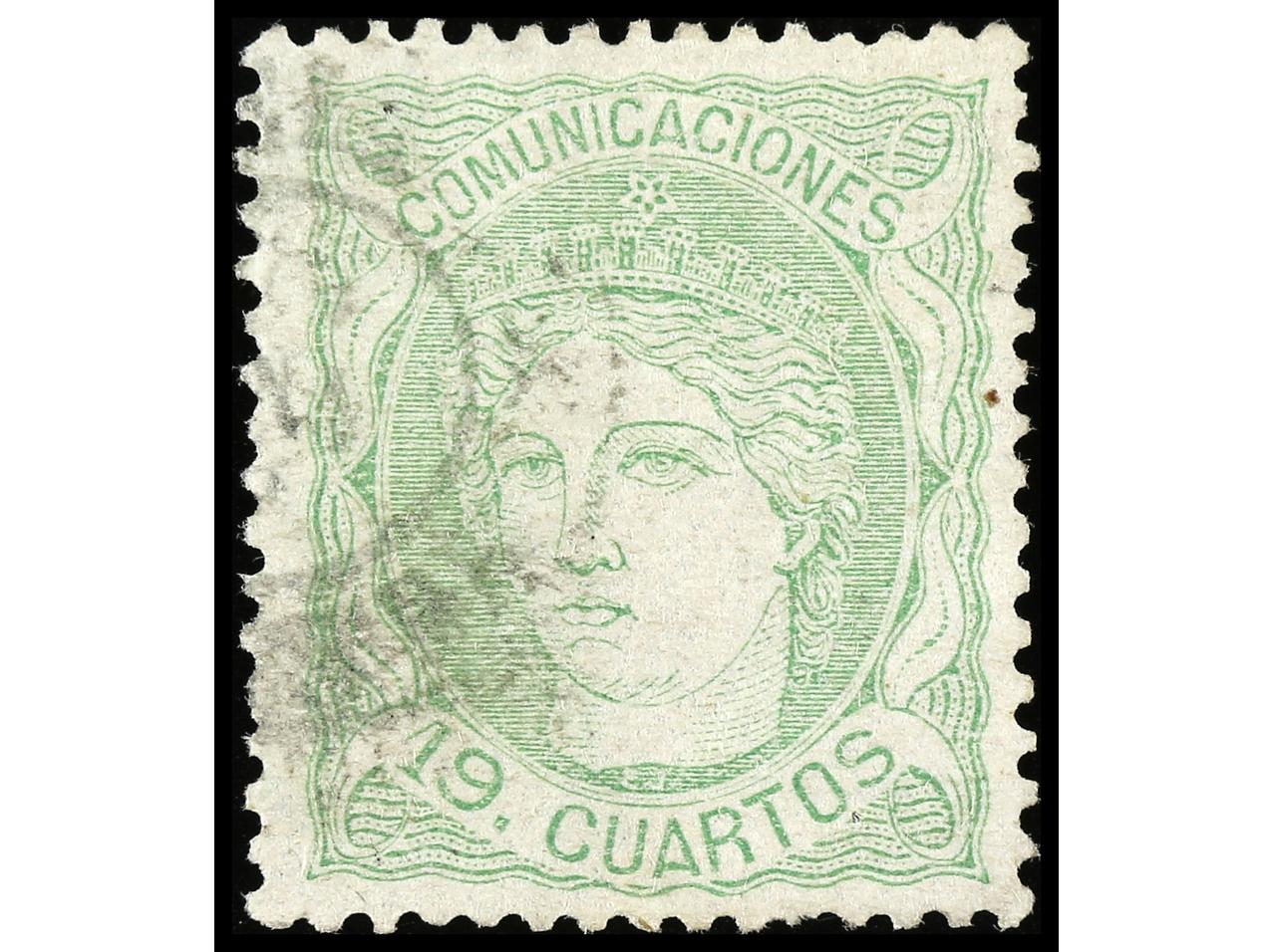 ESPAÑA. 19 cuartos verde. Muy bien centrado. Cert. GRAUS. Ed.114. Cat. 650€. (Image1) (Image2)
