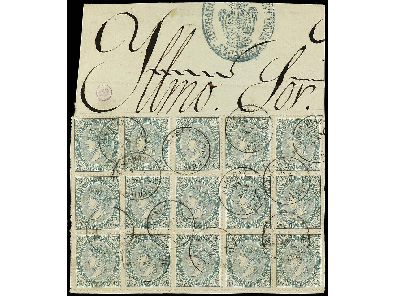 ESPAÑA. 1868. Gran fragmento de Póliza Judicial con un bloque de 15 sellos del 200 mils. verde. Mat. fechador ALCARAZ/ALBACETE. MUY BONITO y RARO. Ed.100 (15).