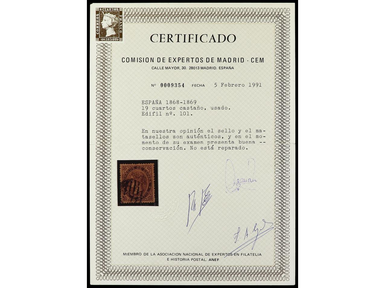 ESPAÑA. 19 cuartos castaño, centraje perfecto. MAGNÍFICO EJEMPLAR, raro así. Cert. CEM. Ed.101. Cat. 850€. (Image1) (Image2)