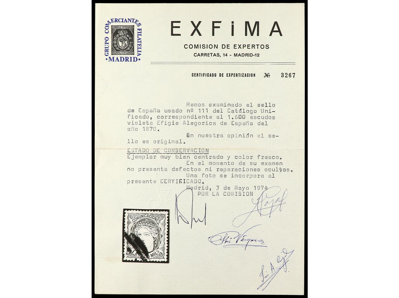 ESPAÑA. 1 Esc. 600 mils. violeta, centraje perfecto. LUJO. Cert. EXFIMA. Ed.111. Cat. 1.550€. (Image1) (Image2)