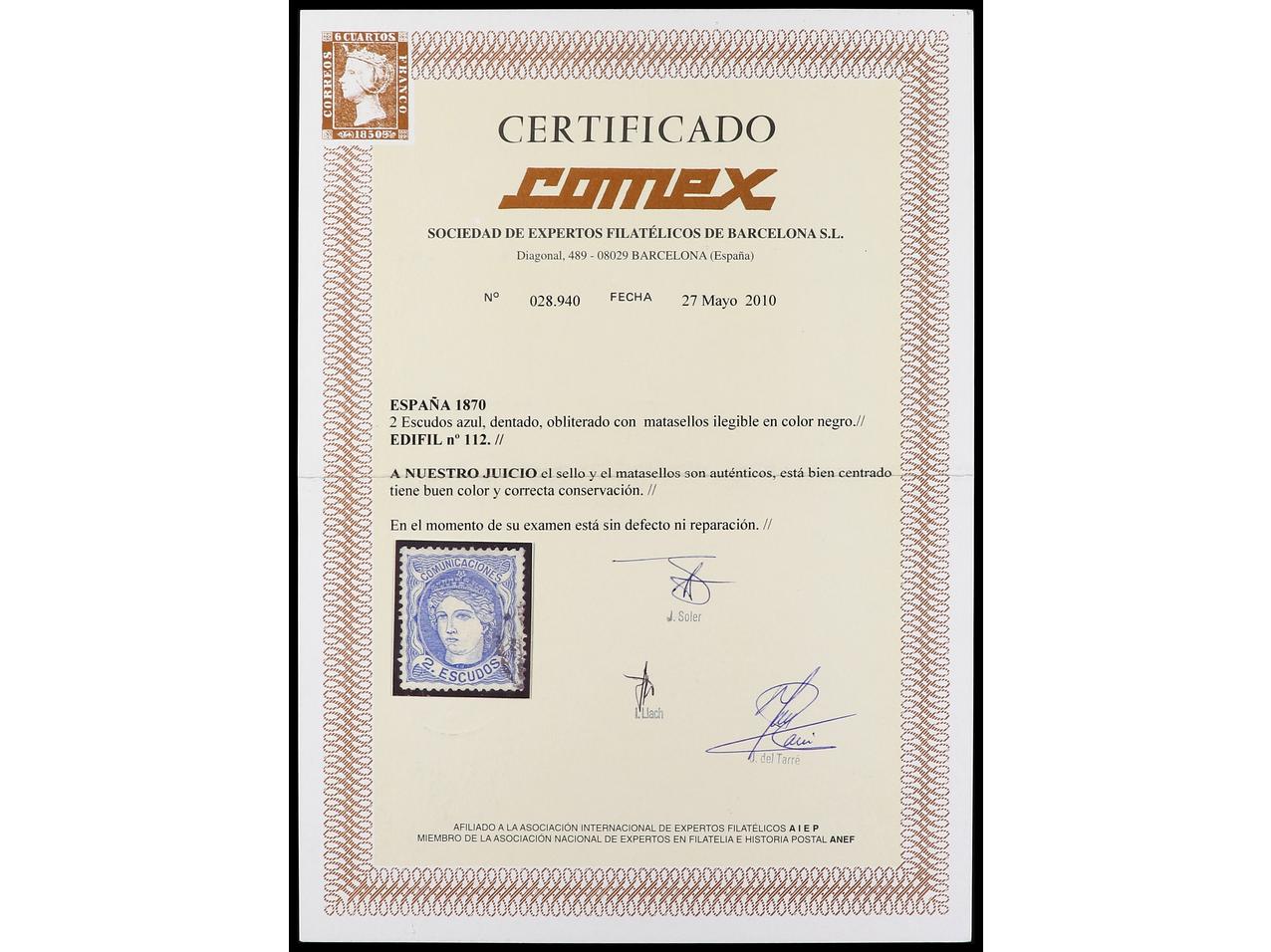 ESPAÑA. 2 Esc. azul. MAGNÍFICO EJEMPLAR. Cert. COMEX. Ed.112. Cat. 530€. (Image1) (Image2)