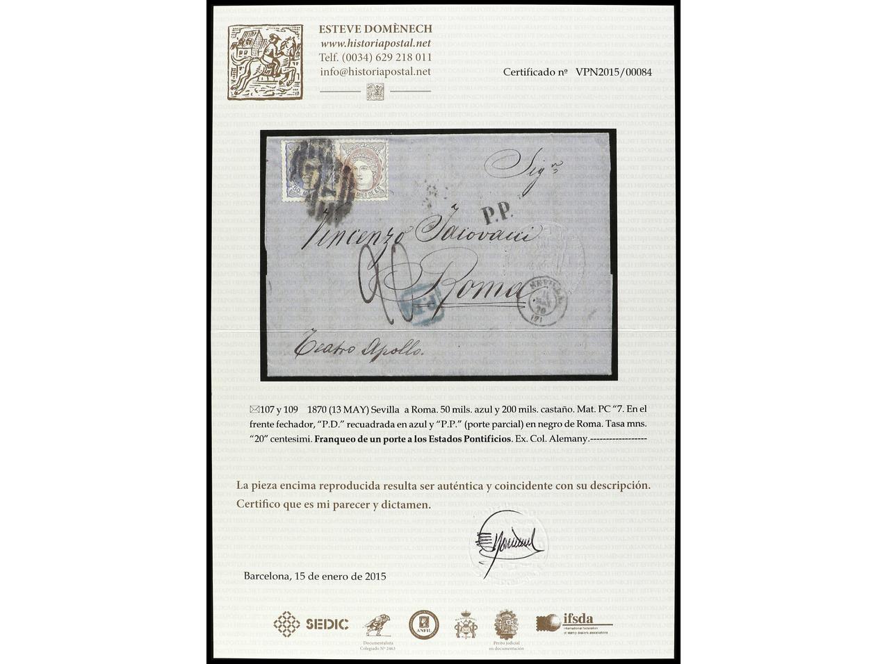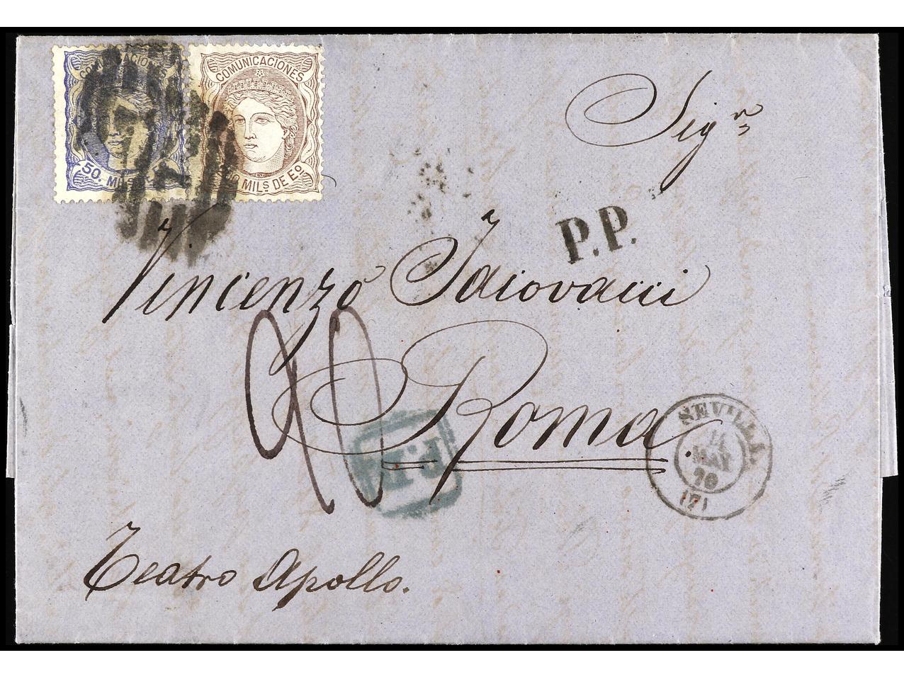 ESPAÑA. 1870. SEVILLA a ROMA. 50 mils. azul y 200 mils castaño, carta tasada con ´20´ cts. a la llegada. Porte parcial de 250 mils. a los Estados Pontificios. Ex. ALEMANY. Cert. E. Domenech. Ed.107, 109. (Image1) (Image2)