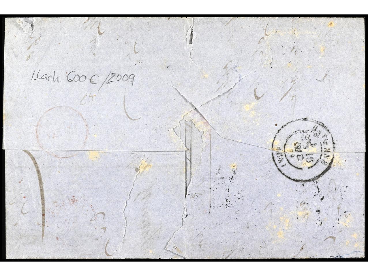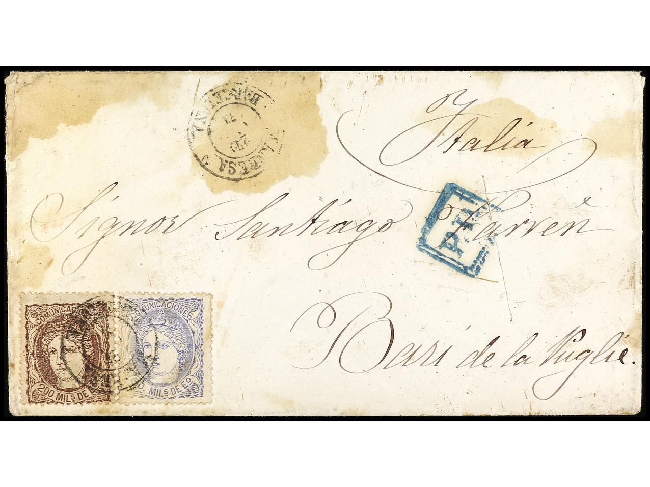 ESPAÑA. 1871. MANRESA a BARI (Italia). 50 mils. azul y 200 mils. castaño. Carta DESINFECTADA (corte de desinfección y manchas de vinagre). RARO franqueo en exceso de 50 mils. MUY RARA. Cert. Graus, E. Domenech. Ed.107, 109. (Image1) (Image2)