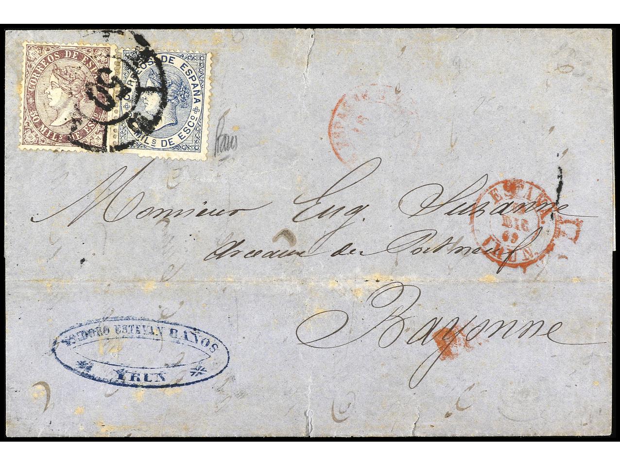 ESPAÑA. 1869. IRUN a BAYONA. 25 mils. azul (defecto en origen) y 50 mils. violeta FRONTERIZO. Cert. E. Domenech. Ed.97, 98. (Image1) (Image2)