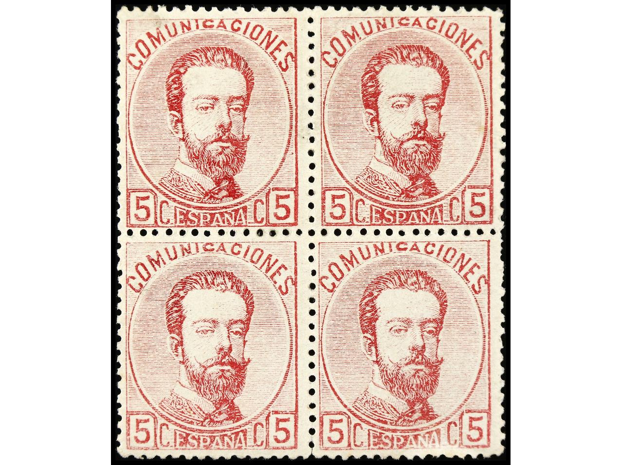 ESPAÑA. 5 cts. rosa. Bloque de cuatro. Sellos inferiores sin fijasellos. Ed.118. Cat. 169€. (Image1)