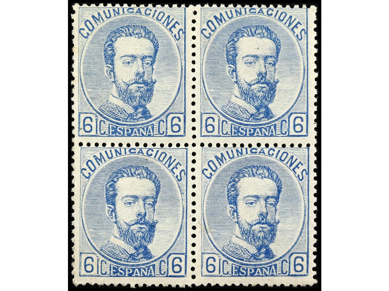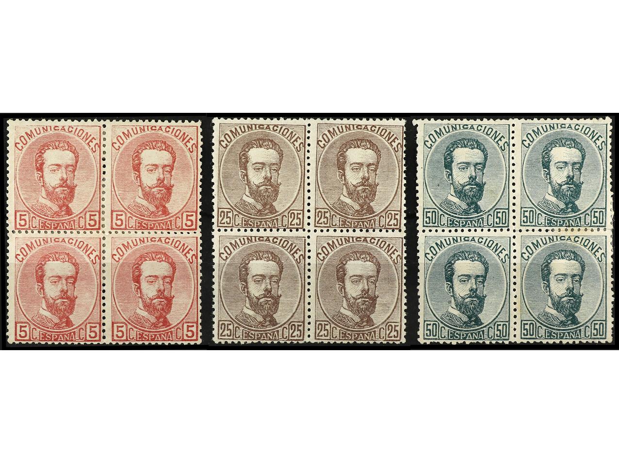 ESPAÑA. 5 cts. rosa, 25 cts. castaño y 50 cts. verde. Bloques de cuatro. Colores muy frescos, sello de 50 cts. leve pliegue en los sellos de la derecha. Ed.118 (4), 124 (4), 126 (4). Cat. 994€. (Image1)