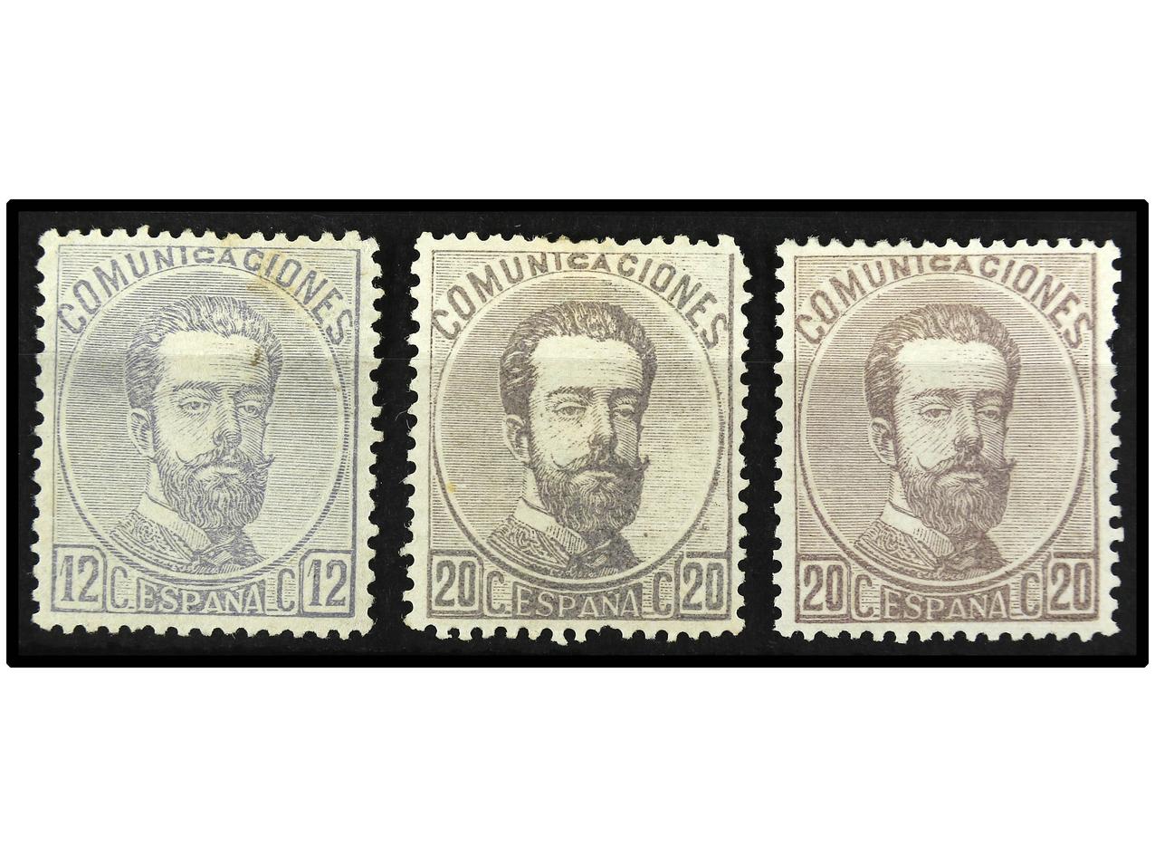 ESPAÑA. 12 c. gris sin goma, 20 c. gris dentado, retocado y 20 c. lila un diente corto. Centrados. Ed.122, *123, *123a. Cat. 290€. (Image1) (Image2)