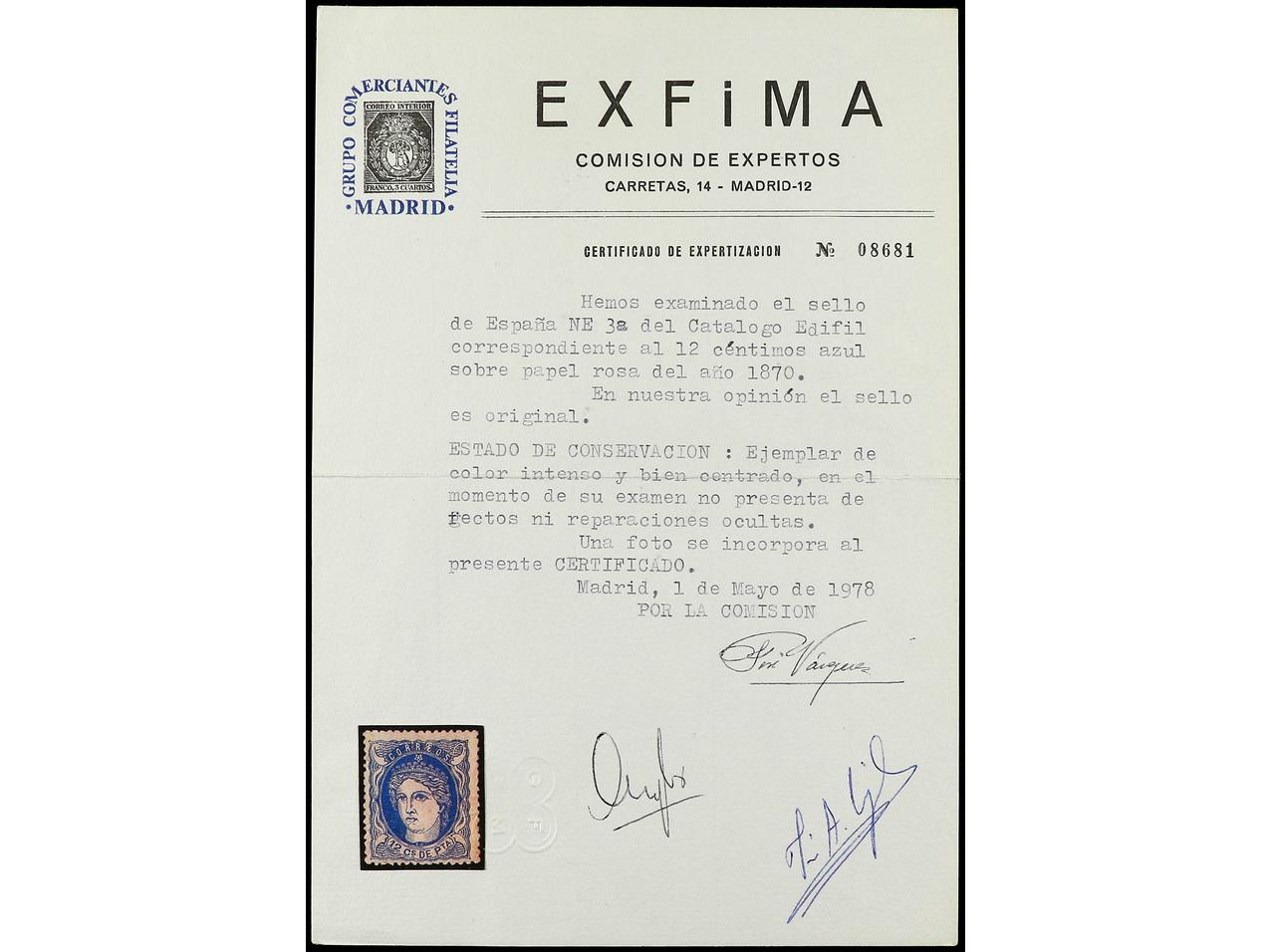 ESPAÑA. 12 céntimos azul sobre rosa. EXTRAORDINARIAMENTE RARO, muy pocos ejemplares conocidos. Cert. EXFIMA (1978). Ed.NE 3a. (Image1) (Image2)