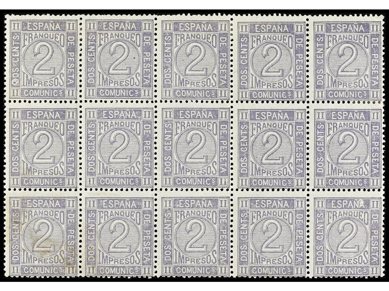 ESPAÑA. 2 cts. gris. Bloque de 15 sellos, centraje de la emisión, ocho sin fijasellos. Excelente calidad. Ed.116. Cat. 618€. (Image1)