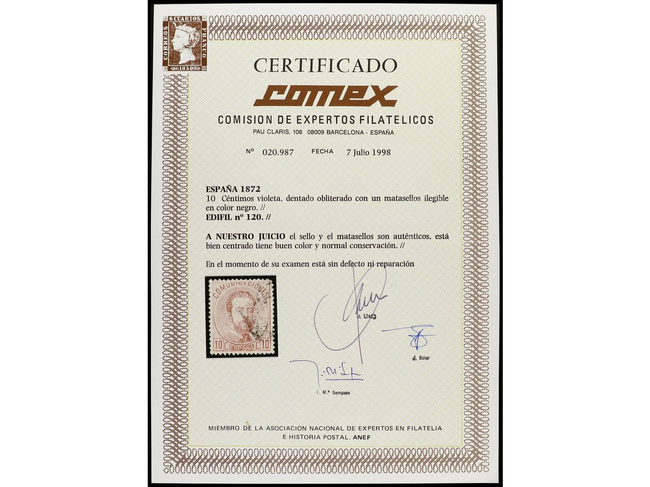 ESPAÑA. 10 céntimos violeta. Centrado de LUJO. Cert. COMEX. Ed.120. Cat. 400€. (Image1) (Image2)