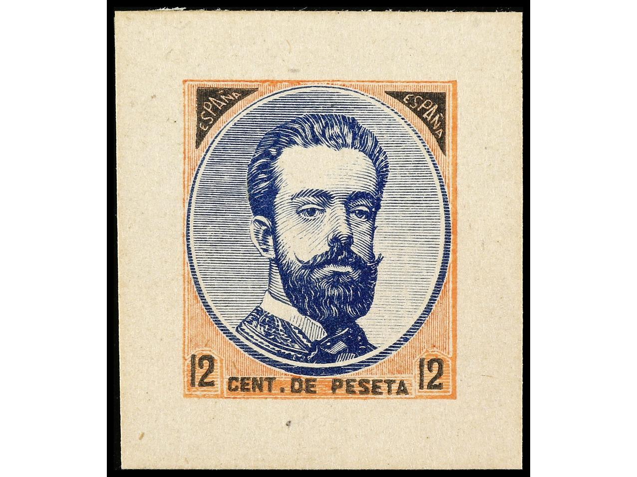 ESPAÑA. 12 cts. naranja, negro y azul. PRUEBA DE PUNZÓN (Gálvez 705). Ed.122. (Image1)