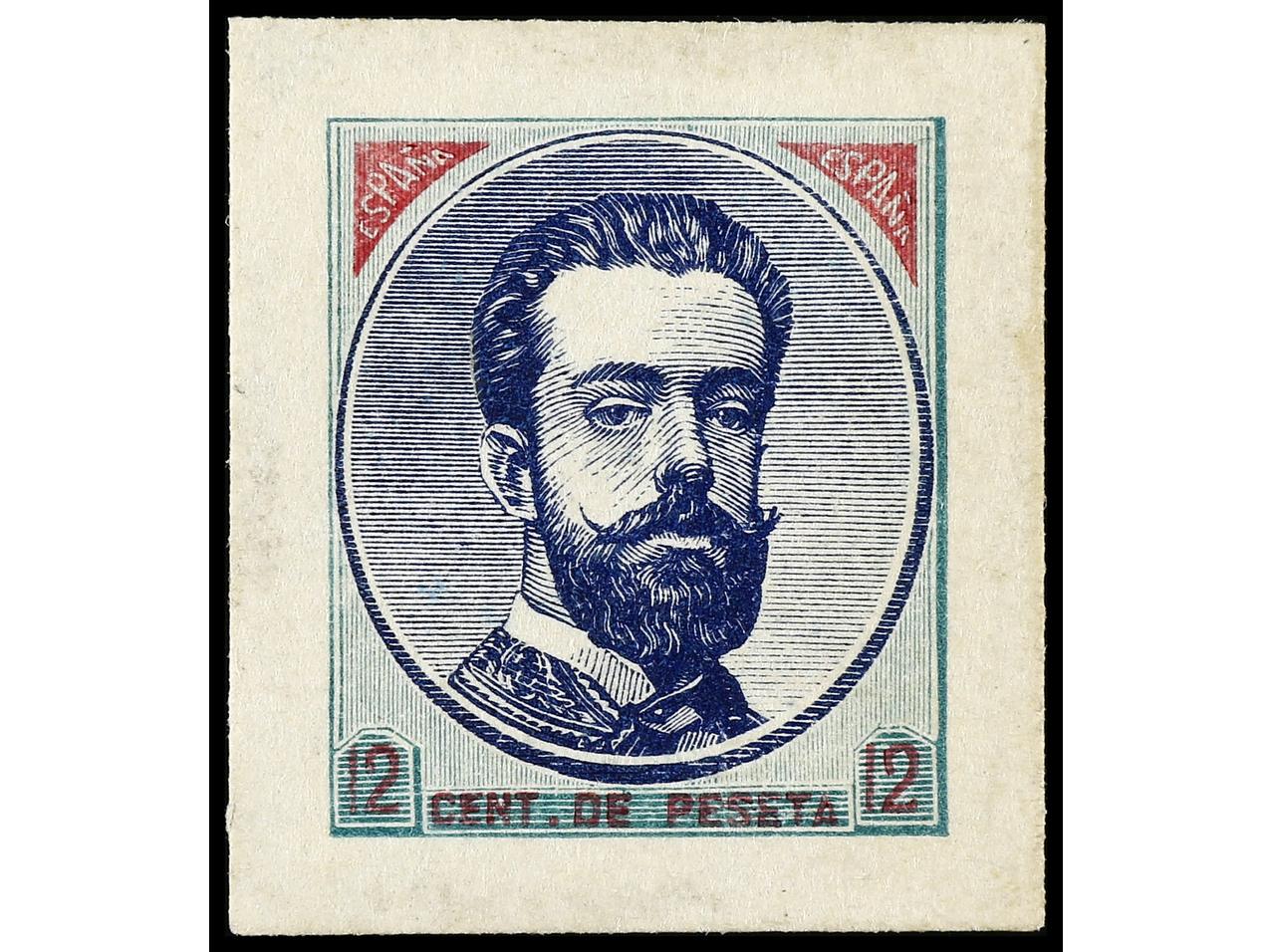 ESPAÑA. 12 cts. verde, carmín y azul. PRUEBA DE PUNZÓN (Gálvez 703). Ed.122. (Image1)