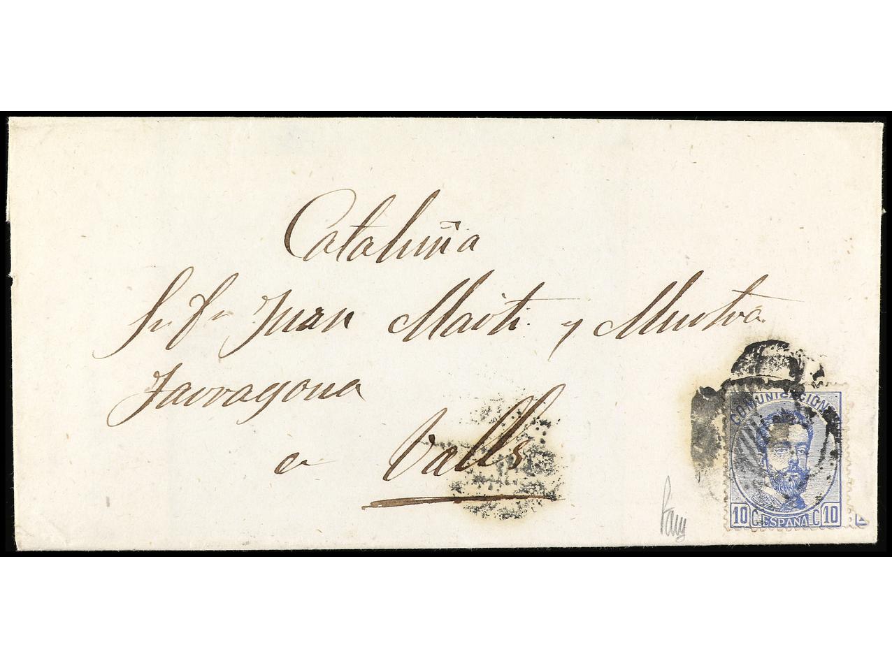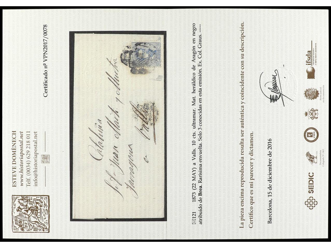 ESPAÑA. 1873. Sobre circulado a Valls. 10 cts. azul mat. especial con el Escudo Heráldico de Brea (Aragón). RARA. Cert. E. Domenech. Ed.121.