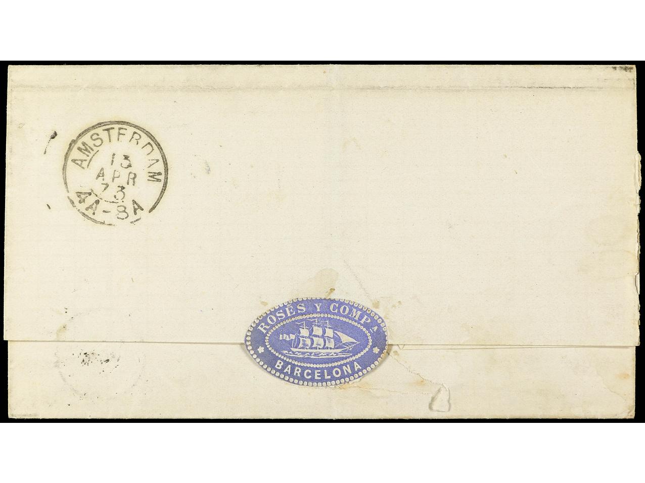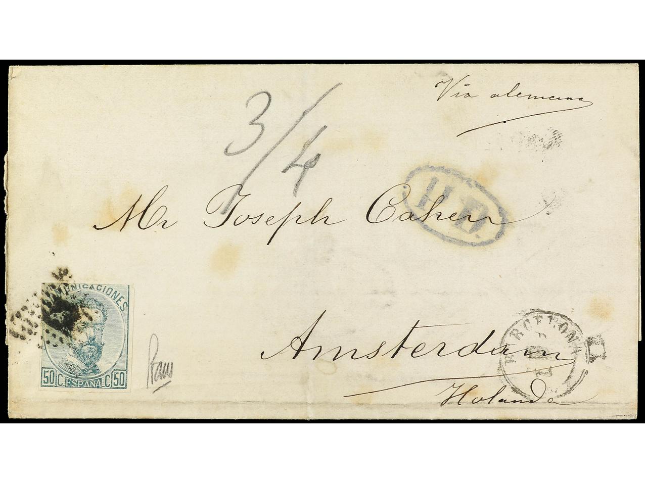 ESPAÑA. 1873. BARCELONA a AMSTERDAM. 50 cts. verde, sello con el dentado recortado en origen. RARA. Firmado GRAUS. Ed.126. (Image1) (Image2)