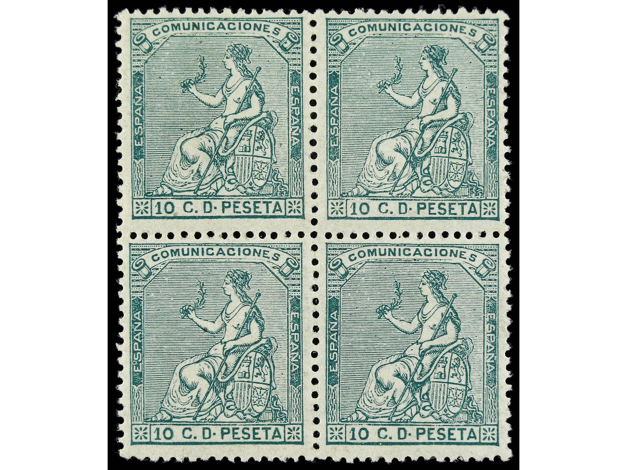 ESPAÑA. 10 cts. verde. Bloque de cuatro. Centraje perfecto. LUJO. Ed.133 (4). (Image1)