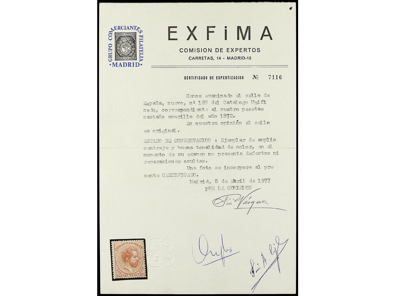 ESPAÑA. 4 pesetas castaño. Buen ejemplar. Cert. EXFIMA y COMEX. Ed.128. Cat. 520€. (Image1) (Image2)