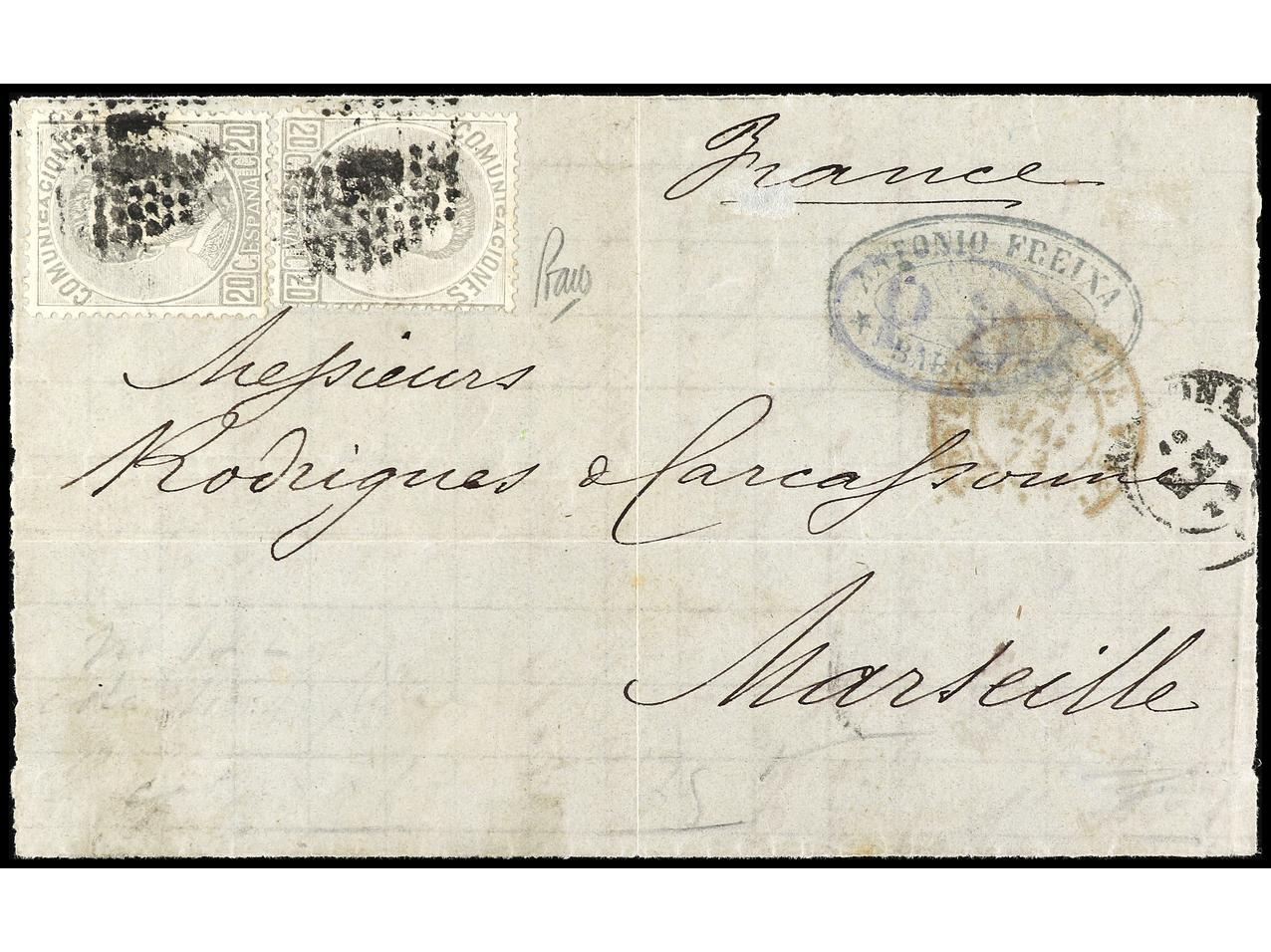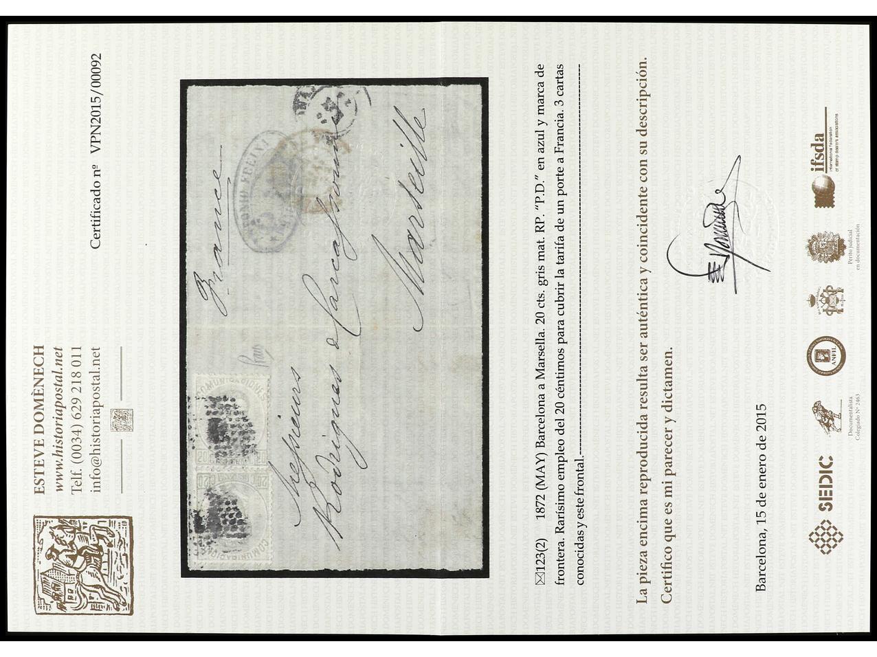 ESPAÑA. 1873. BARCELONA a MARSEILLE (Francia). 20 cts. gris (2). MUY RARO el 20 cts. gris en carta. PRECIOSA. Cert. COMEX. Ed.123 (2). (Image1) (Image2)